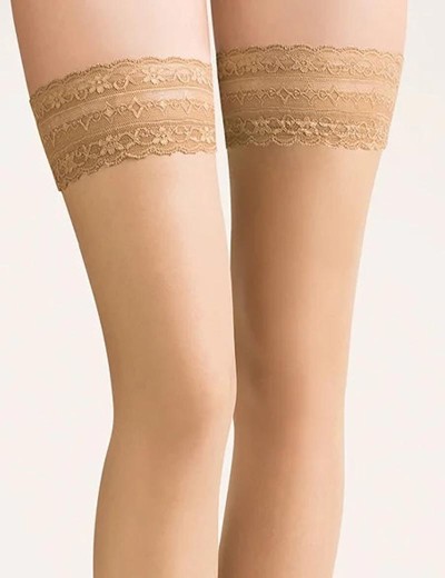 С прозрачным мыском и формованной пяткой. Широкая кружевная резинка на двойном силиконе надежно фиксирует чулки на ноге.