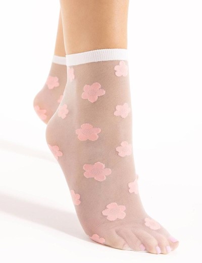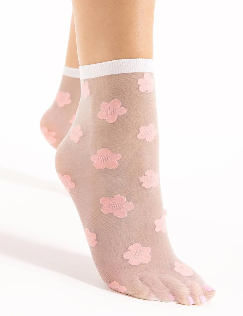 Тонкие носки JODIE польского бренда Fiore плотностью 20 den с крупным цветочным узором идеально подходят для теплой погоды.