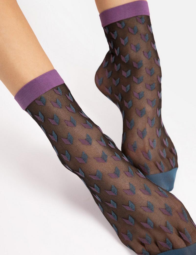 Полупрозрачные носки 1176/G DIZZY польского бренда Fiore плотностью 20 den с эффектным геометрическим узором на чёрном фоне. Резинка и мысок выделены однотонными контрастными цветами в интересном цветовом наборе из осенней палитры.