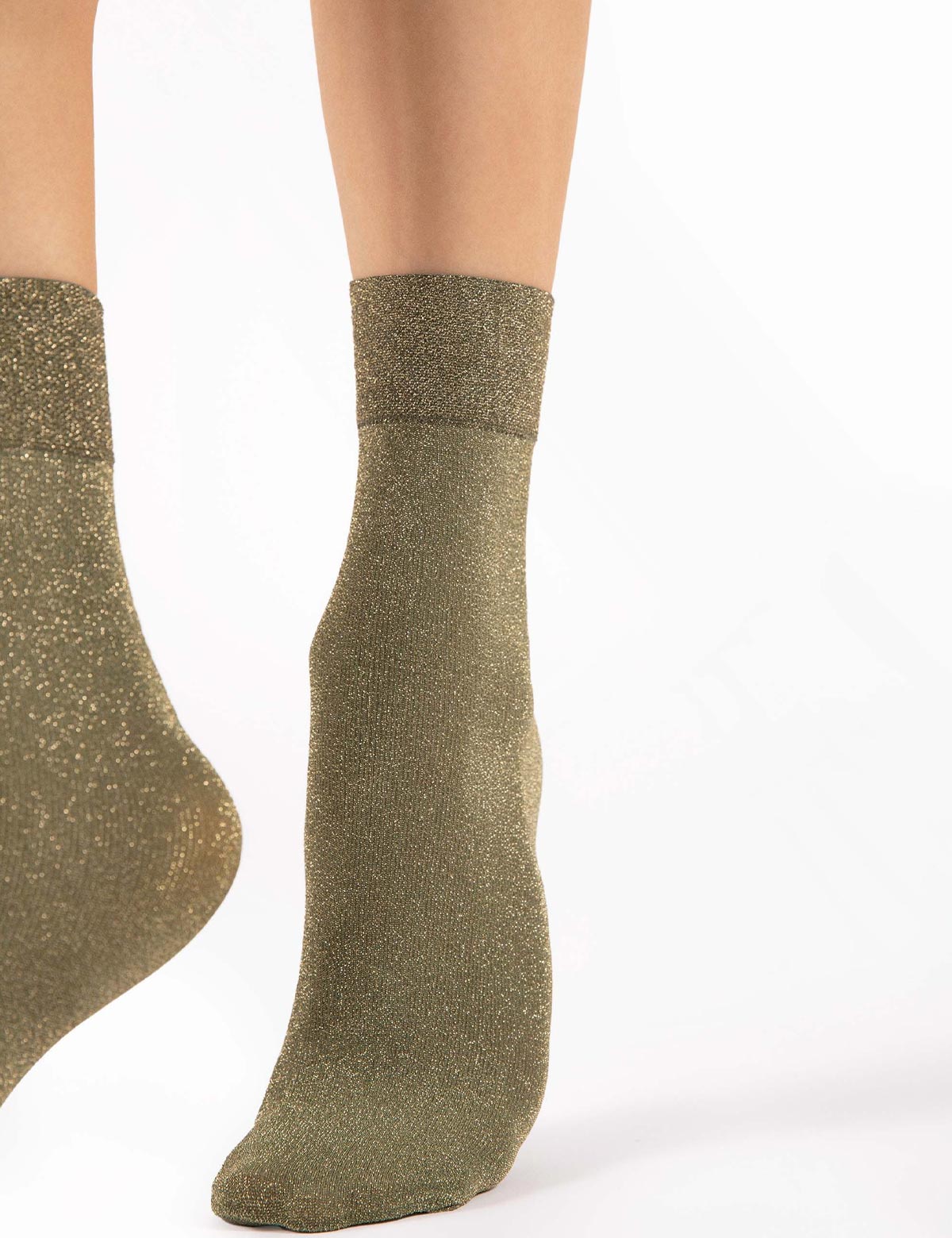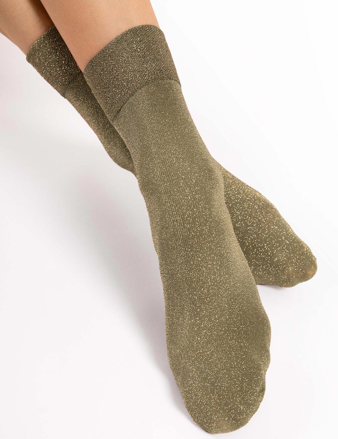 Блестящие носки из микрофибры 1178/G BRILLO польского бренда Fiore плотностью 60 den выполнены по технологии 3D в приглушённо-зелёной расцветке «хаки» с добавлением золотистого люрекса.