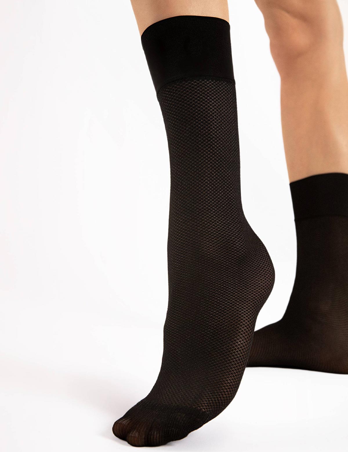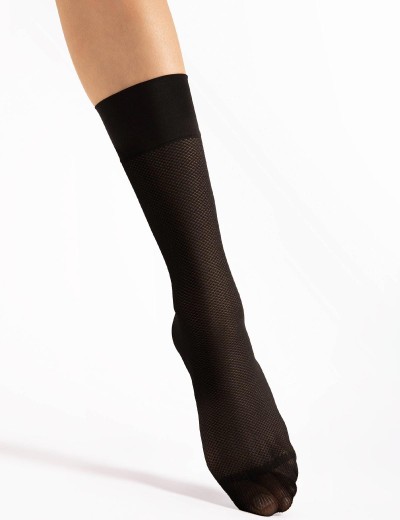 Женские носки 1168/G FOXTROT польского бренда Fiore плотностью 20 den отличаются сетчатой структурой и широкой резинкой, выполнены по технологии 3D-оплетки в чёрном цвете с лёгким мерцающим блеском.