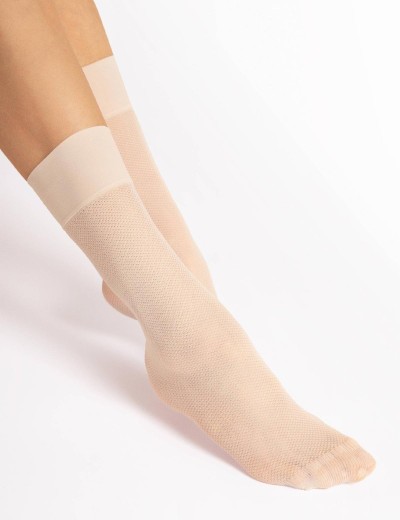 Женские носки 1168/G FOXTROT польского бренда Fiore плотностью 20 den отличаются сетчатой структурой и широкой резинкой, выполнены по технологии 3D-оплетки в цвете экрю с лёгким мерцающим блеском.