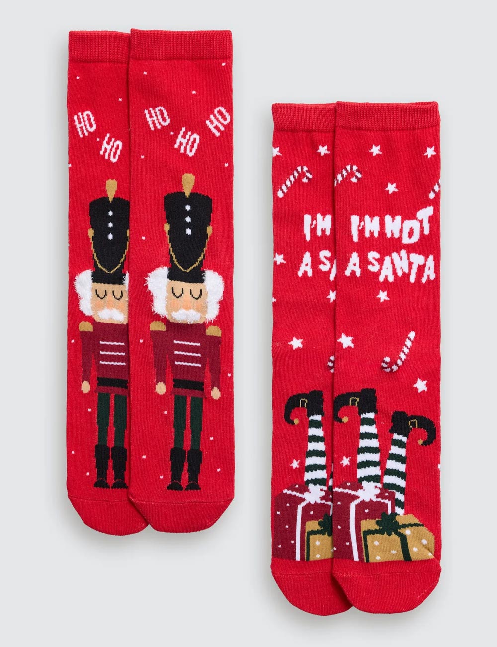 Женские носочки в наборе из 2-х штук от испанского бренда Ysabel Mora модель 12974 из новогодней коллекции CHRISTMAS. Выполнены из мягкого хлопка в красном цвете с оригинальными тематическими принтами.