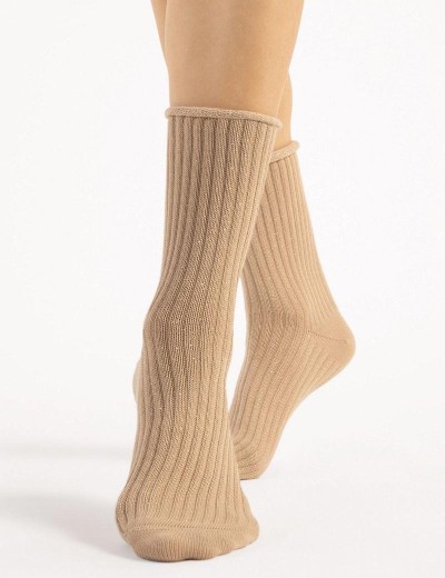 Женские хлопковые носки 1171/G TRINNY польского бренда Fiore в бежевом цвете с ребристым узором и серебристой люрексовой нитью. Подходят как для повседневной носки, так и в качестве элегантного аксессуара.