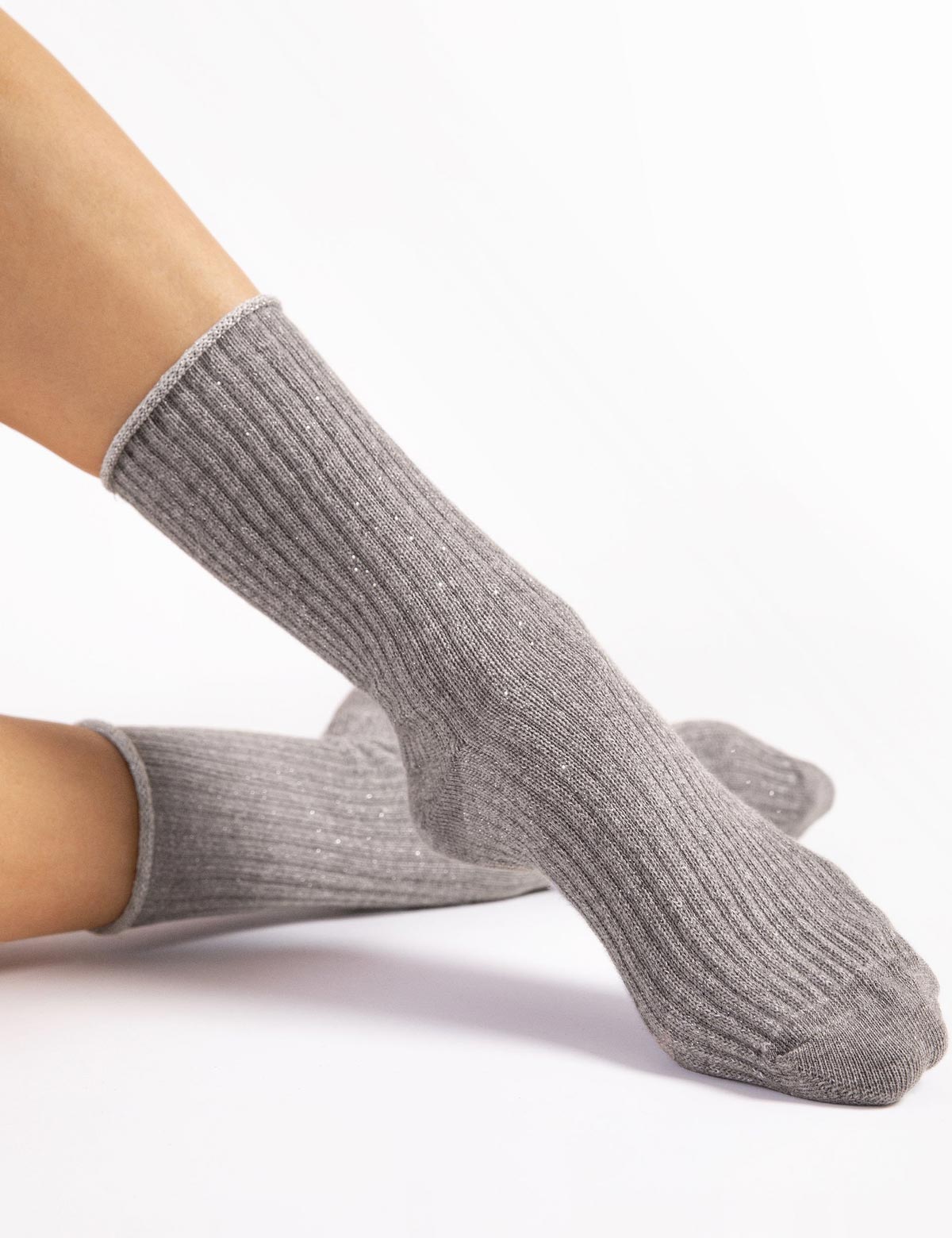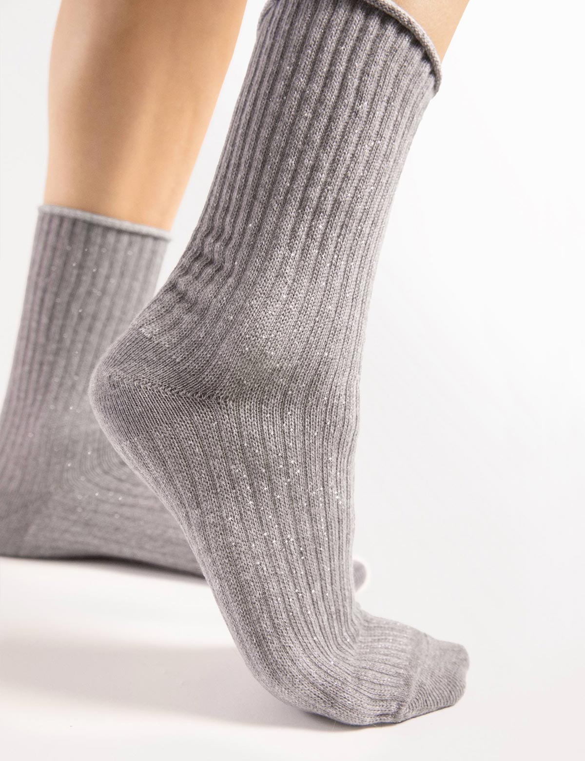 Женские хлопковые носки 1171/G TRINNY польского бренда Fiore в сером цвете с ребристым узором и серебристой люрексовой нитью. Подходят как для повседневной носки, так и в качестве элегантного аксессуара.