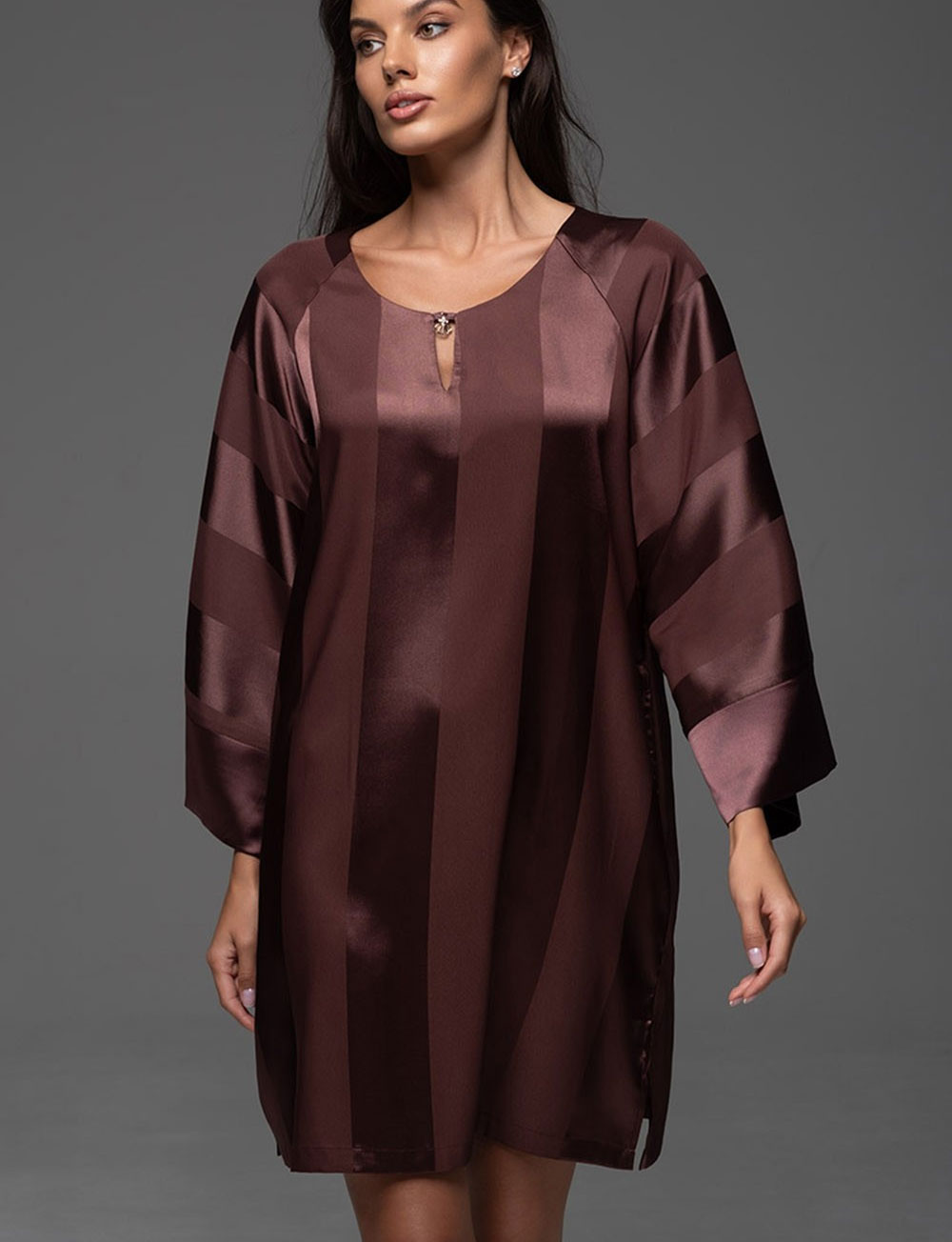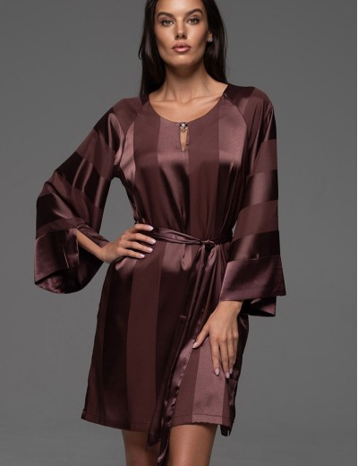 Домашняя туника ILONA 7541 от бренда Mia-Amore свободного силуэта, в цвете шоколада, с длинными широкими рукавами. Чередование матовых и глянцевых жаккардовых полос на мягком шелковистом атласе придает изделию шик и оригинальность. Пояс помогает подчеркнуть талию.