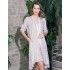 Расклешенного силуэта, с юбкой асимметричной длины, с фигурным вырезом горловины и планкой-застежкой на пуговицах. Планка, кокетка на спине и на полочках декорирована кружевной тесьмой.