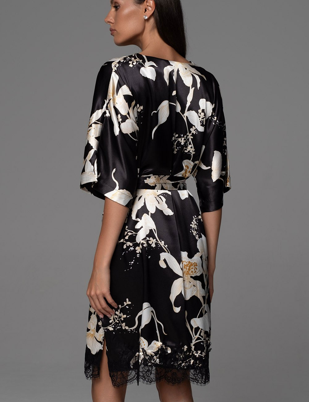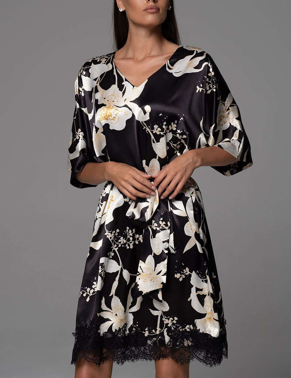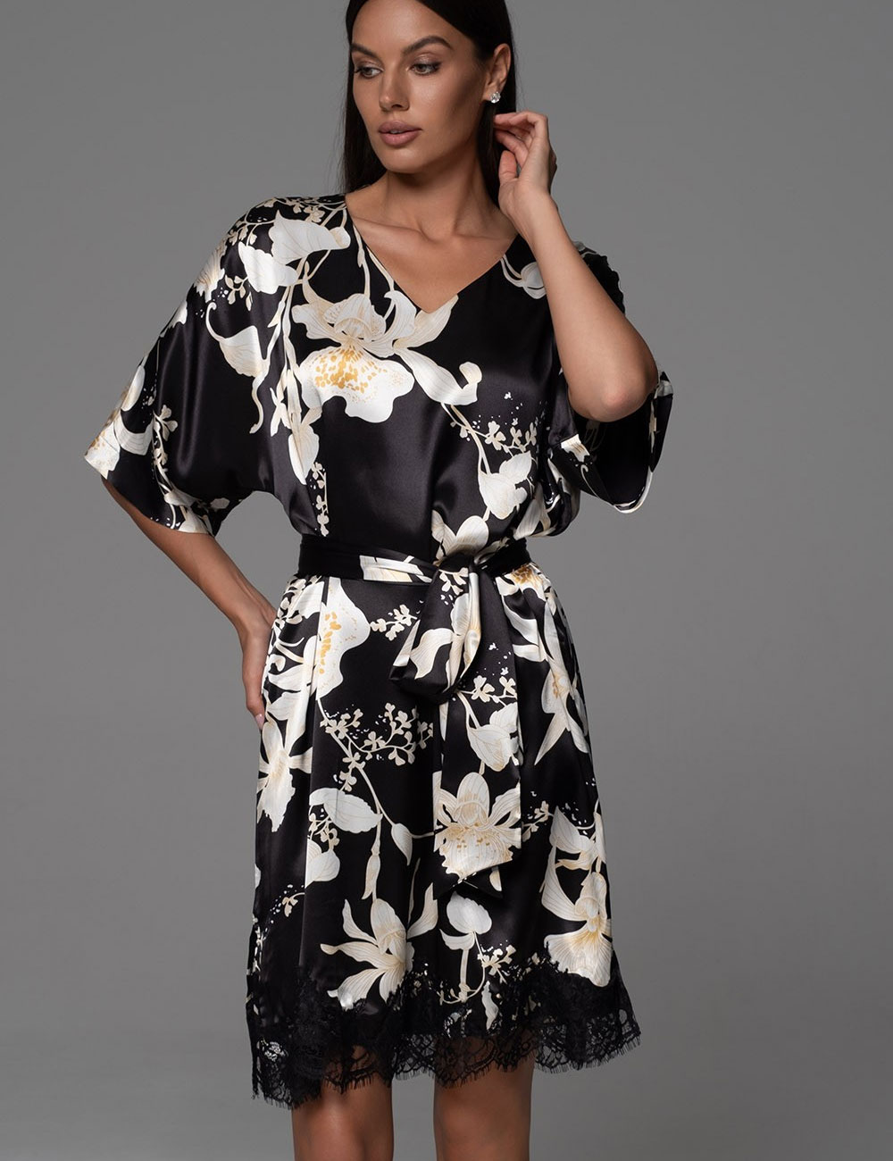 Туника домашняя ARABEL 4357 — это нежный натуральный смесовый шёлк чёрного цвета с белым контурным цветочным принтом, словно приглашение к спокойному дню в облаке комфорта. Кружевной низ добавляет воздушность и лёгкую эйфорию, превращая повседневный отдых в момент женственности. Идеально для тех, кто ценит уют от Mia-Amore!