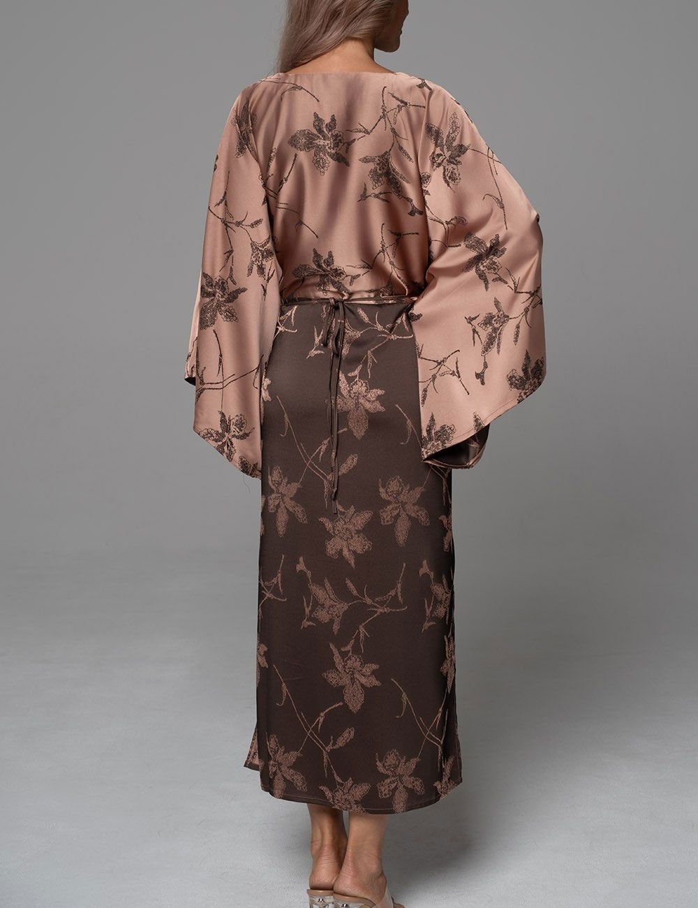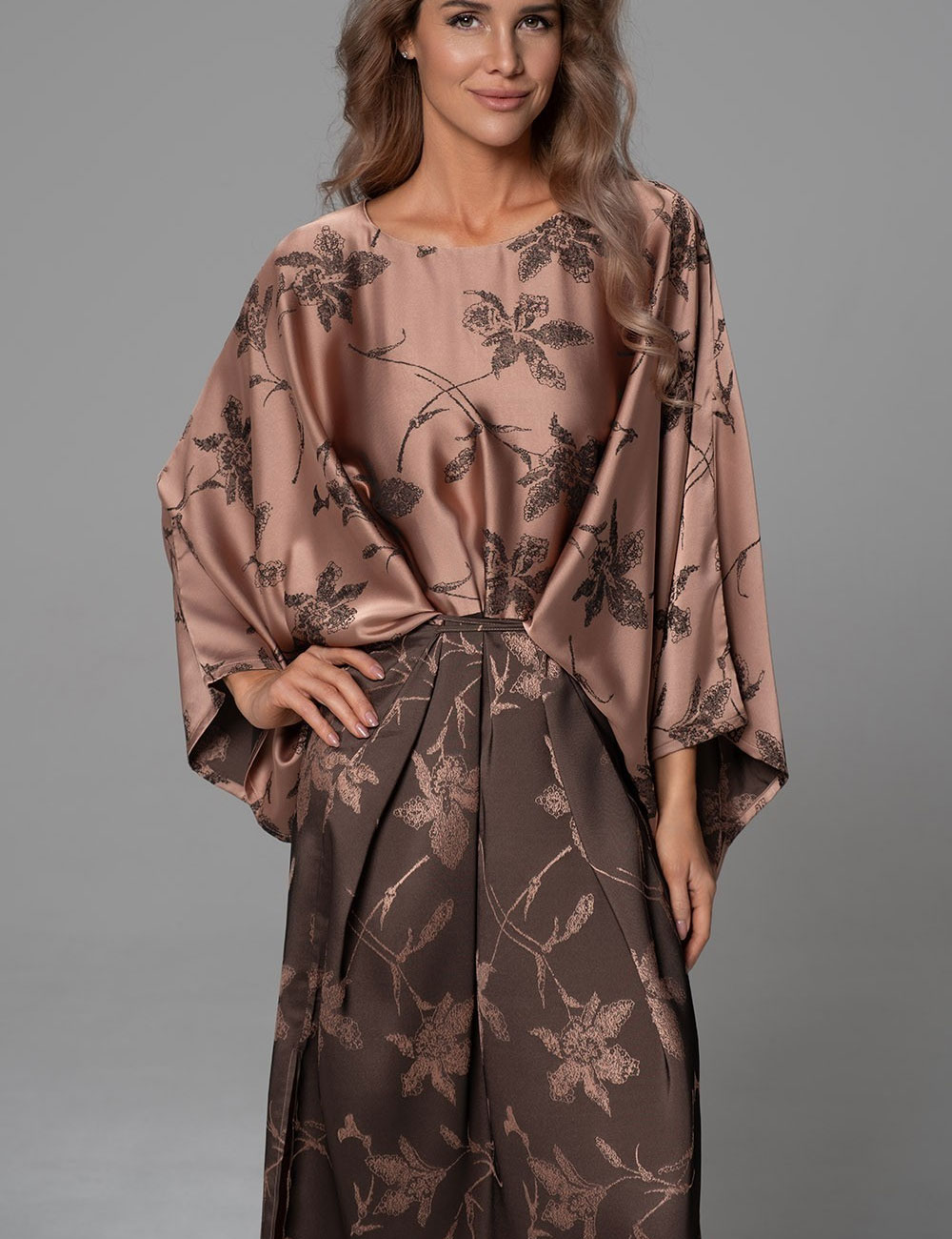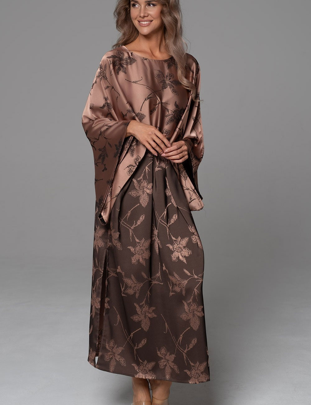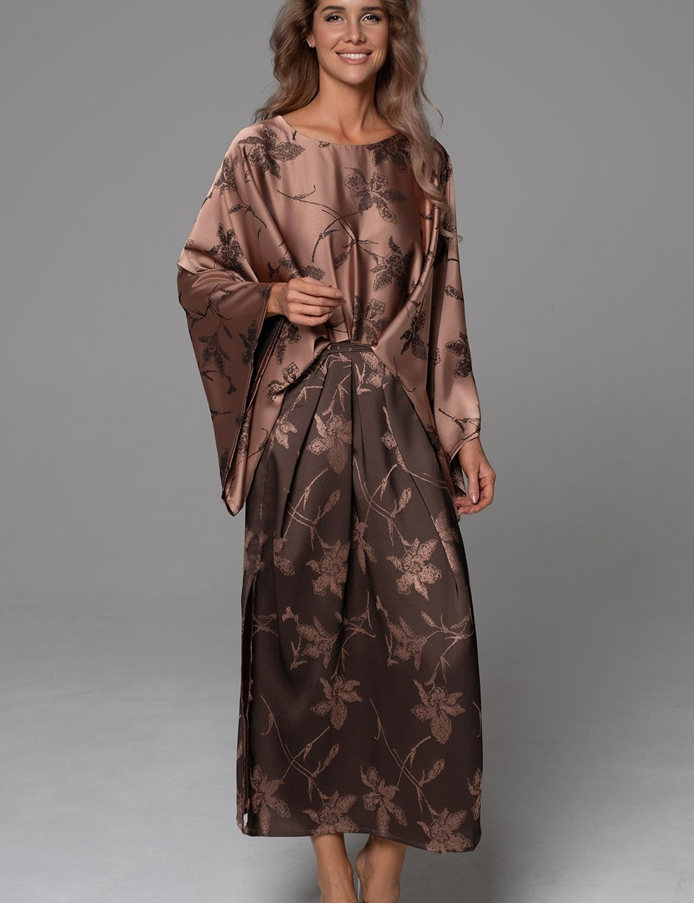 Оригинальная домашняя туника Mia-Amore SHEILA модель 4898 соткана из мягкой шелковистой жаккардовой ткани, где пыльно-розовый переплетается с шоколадными оттенками! Цветочный принт и непринуждённый крой делают её настоящим произведением искусства, полным элегантности и лёгкости для casual ношения.