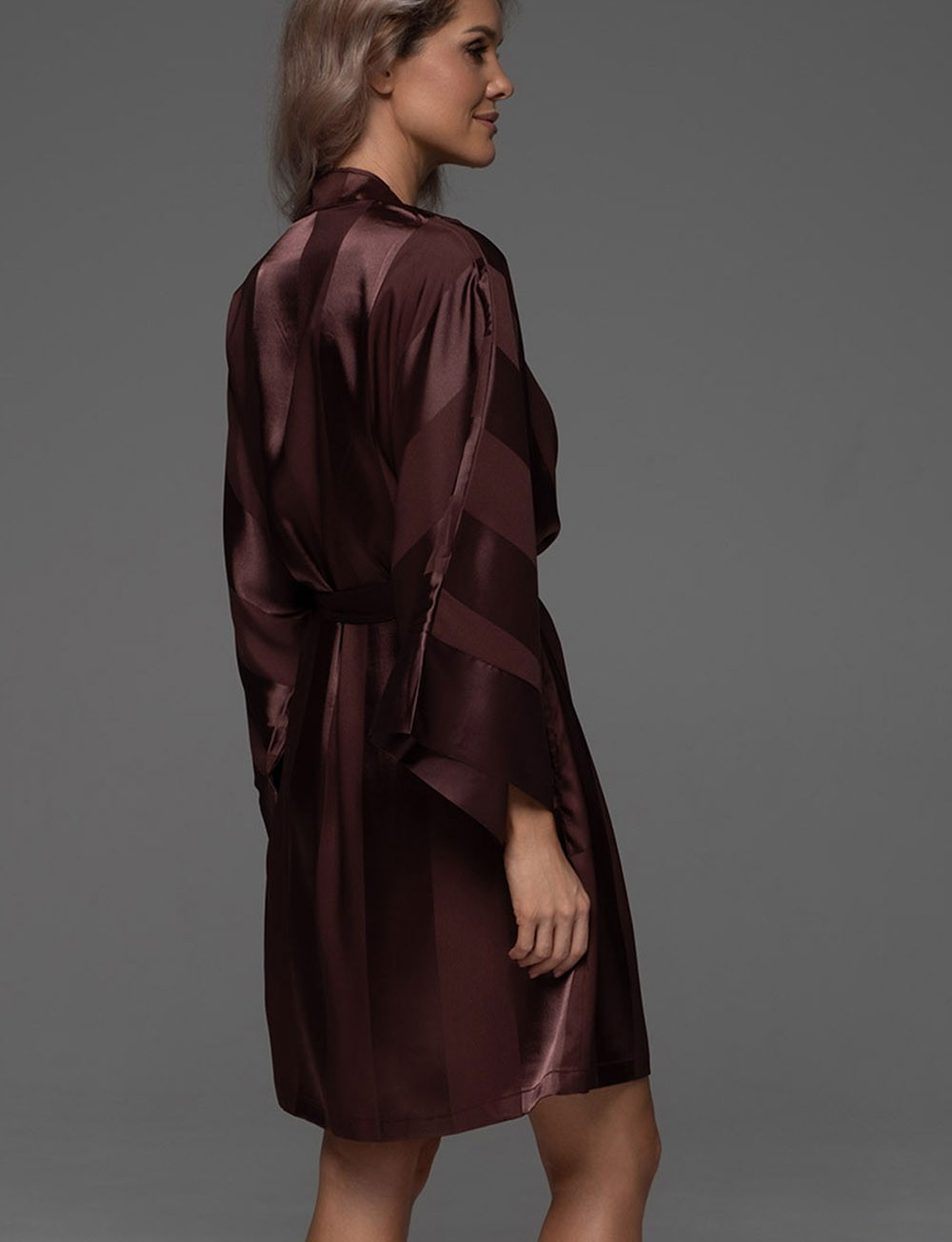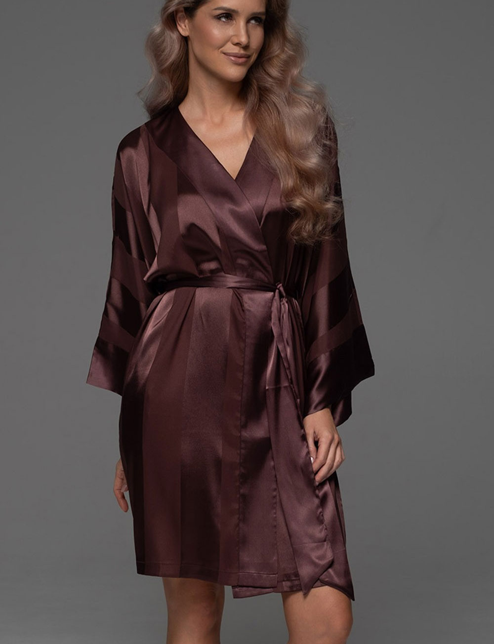 Короткий женский халат ILONA 7543 от бренда Mia-Amore темно-коричневого цвете шоколада, выполнен из мягкого искусственного шёлка на жаккардовой основе. Длинные широкие рукава добавляют элегантность, а матовые и глянцевые полосы создают роскошный вид. Идеален для комфортных моментов дома.