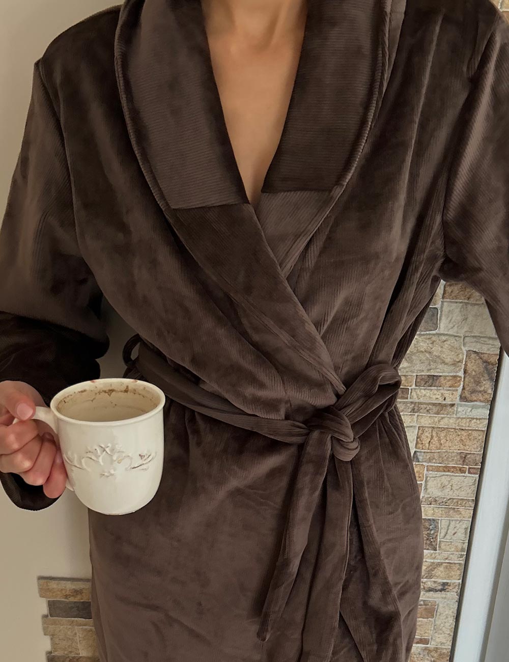 Тёплый халат MILENE от литовского бренда Aruelle выполнен из плотной тёплой ткани в мелкий рубчик с эффектом замши насыщенной шоколадно-коричневой расцветки. Для максимального комфорта и расслабления, сохраняет тепло тела, что делает его идеальным для использования в холодное время года или после водных процедур.