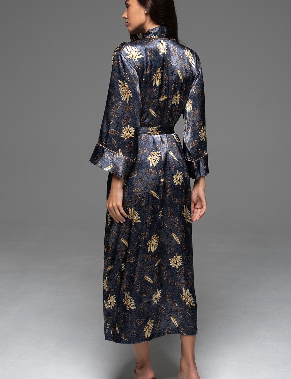 Длинный халат-кимоно MARYGOLD 4699 от Mia-Amore — полный комфорт в смесовом натуральном шёлке с мягким блеском, обещающий абсолютное расслабление. Темно-синий фон оживает бежевыми бутонами, листьями и геометрическим орнаментом, подчеркнутыми контрастным кантом. Дарит ощущение свободы и утончённости в долгих домашних вечерах.