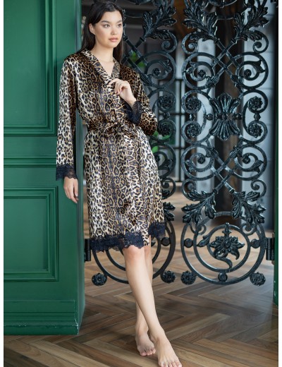 Элегантный домашний халат Opium К-25 с модным леопардовым узором. Изготовлен из нежной, переливающейся ткани, украшенной изысканным черным кружевом. Модель длиной миди, без застежек, идеально подходит для любой фигуры и станет превосходным подарком для близкого человека.