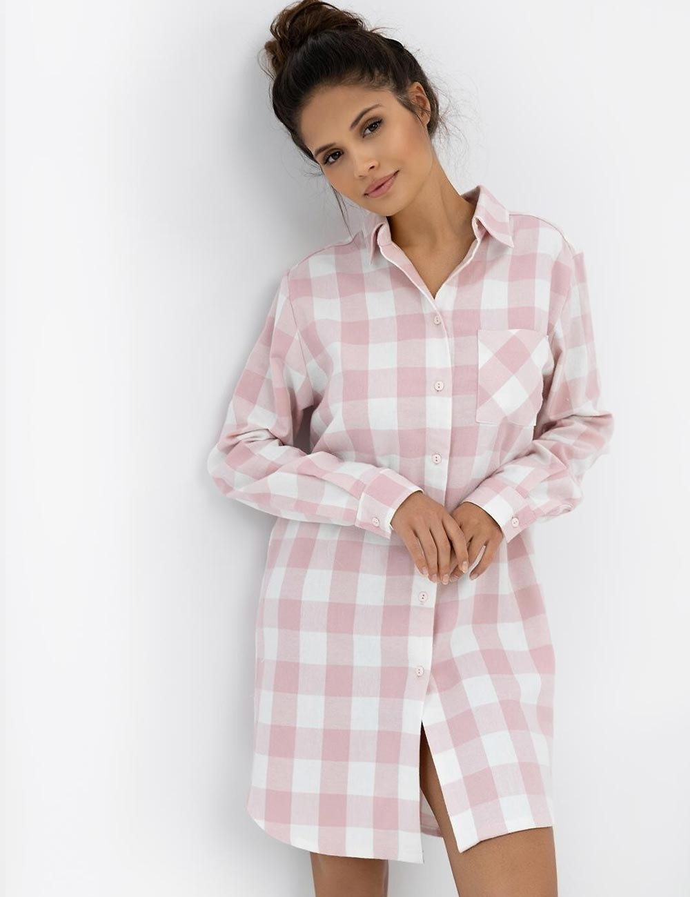 Домашняя рубашка MARLEY от польского бренда Sensis выполнена из мягкой хлопковой фланели в нежных розовых оттенках с модным принтом в крупную клетку. Свободный крой и длина до середины бедра обеспечивают максимальный комфорт в повседневной носке.