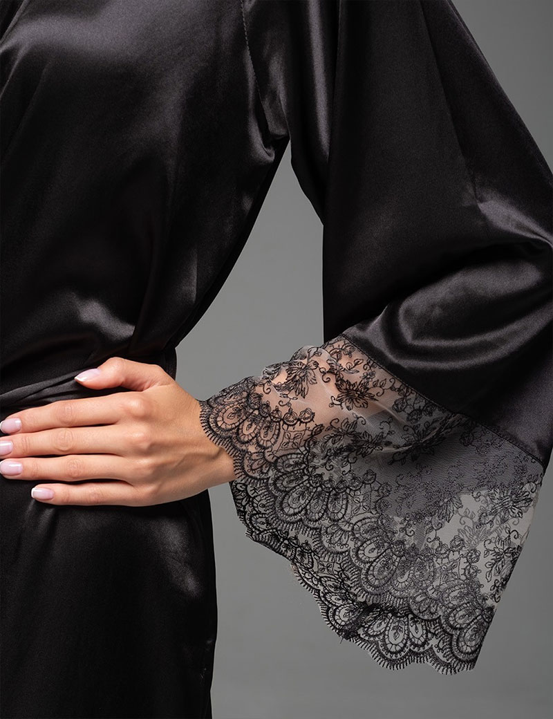 Уютный чёрный халат ADELAIDA 4703 от Mia-Amore из смесового натурального шёлка – идеален для домашних релаксов или романтических вечеров, когда нужен полный комфорт. Длинные рукава-реглан, украшенные вышивным кружевом и вставка на спинке, создают ауру особого момента. Эмоции неги и элегантности позволяют чувствовать себя, как в объятиях любимого.