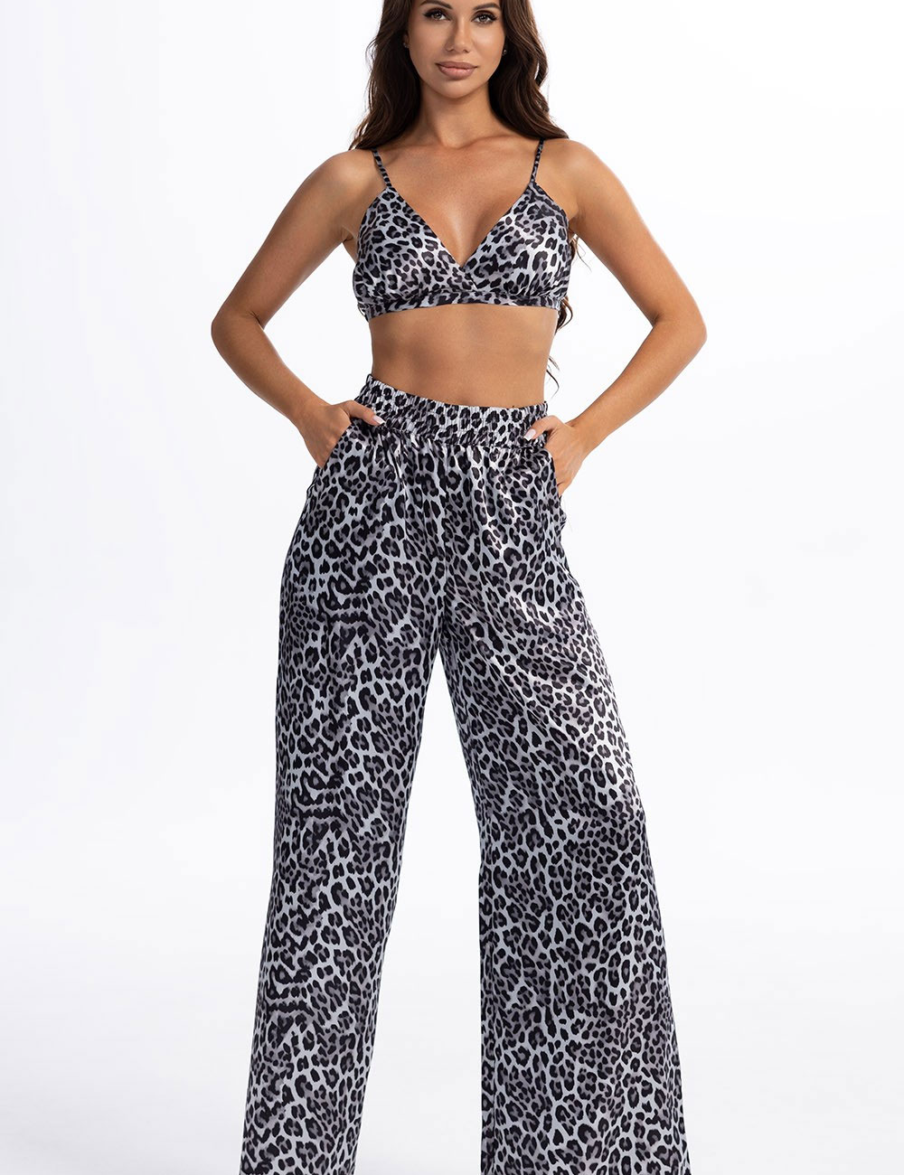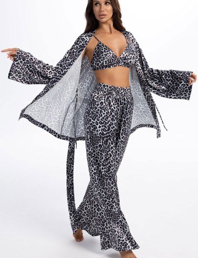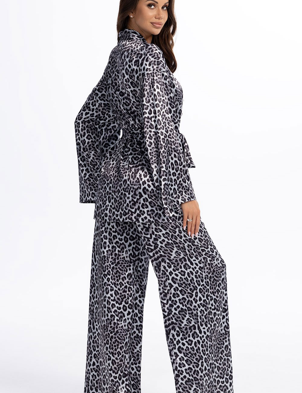 Комплект Mia-Amore MAGGIE 4795 из смесового натурального шёлка с леопардовым принтом. Состоит из запашного пеньюара, брюк-палаццо и крок-топа.