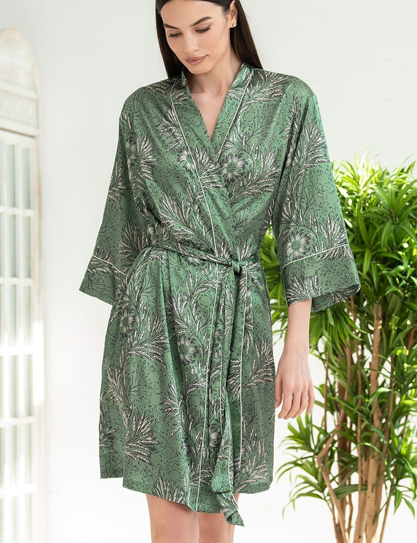 Короткий запашной халат ELOISA 7483 от Mia-Amore идеален для утреннего кофе или вечернего отдыха, станет вашим любимым спутником в мире домашнего уюта. Выполнен из шелковистого атласа, который словно струится по вашему телу. Нежный растительный принт в мятно-кремовых тонах добавляет свежести, а контрастные канты придают изюминку.