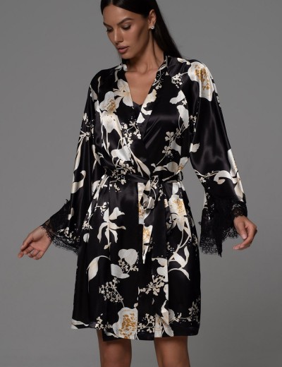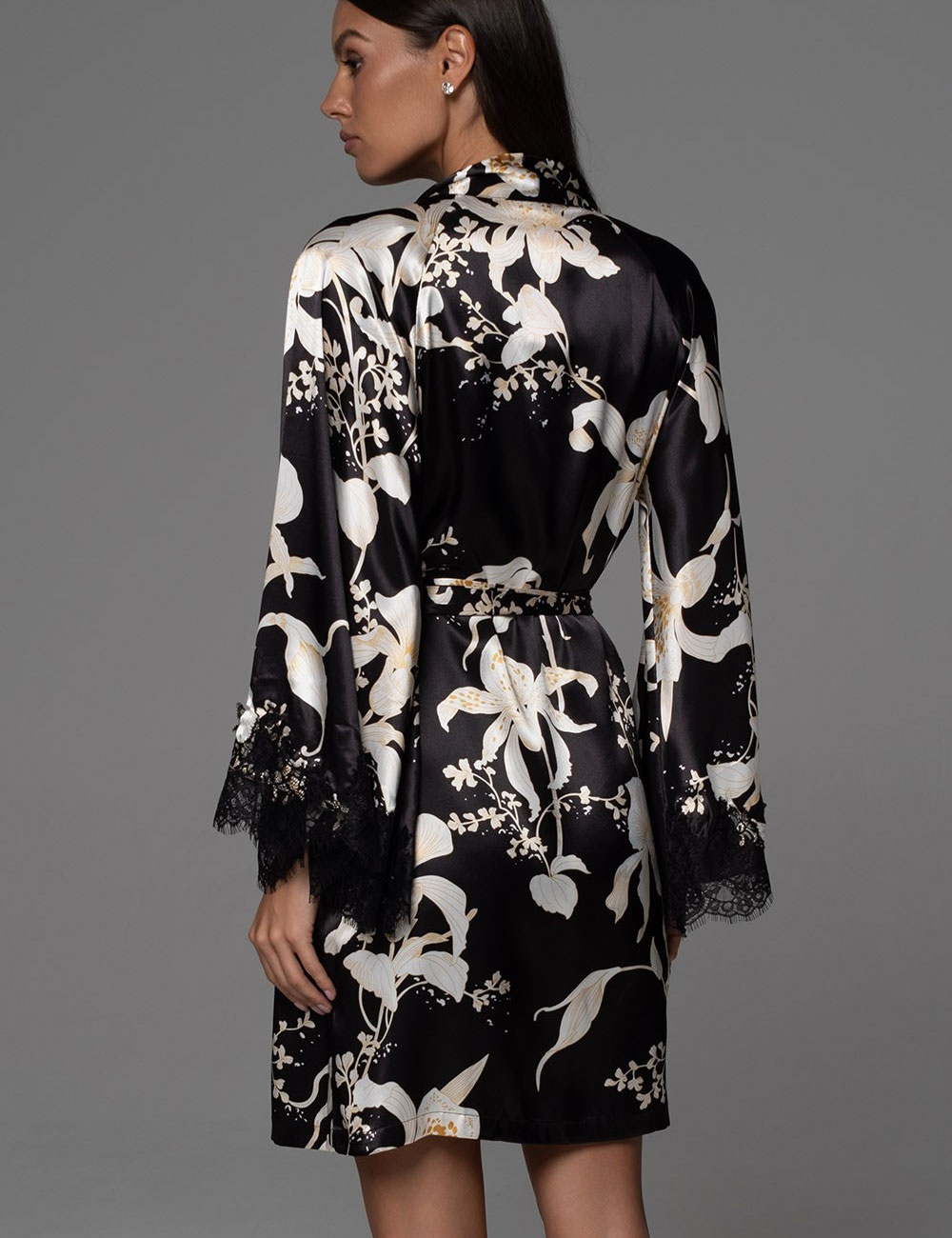 Нежный халат-кимоно ARABEL 4773 от Mia-Amore — это уютный бестселлер из смесового натурального шёлка чёрного цвета с белым рисунком орхидей. Он разбудит в тебе спокойную женственность! Широкое кружево с ресничками по низу рукавов добавляет лёгкость. Идеально для утреннего кофе или вечернего чилла — чувствуй себя королевой в домашнем раю.