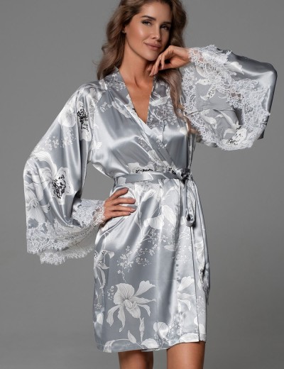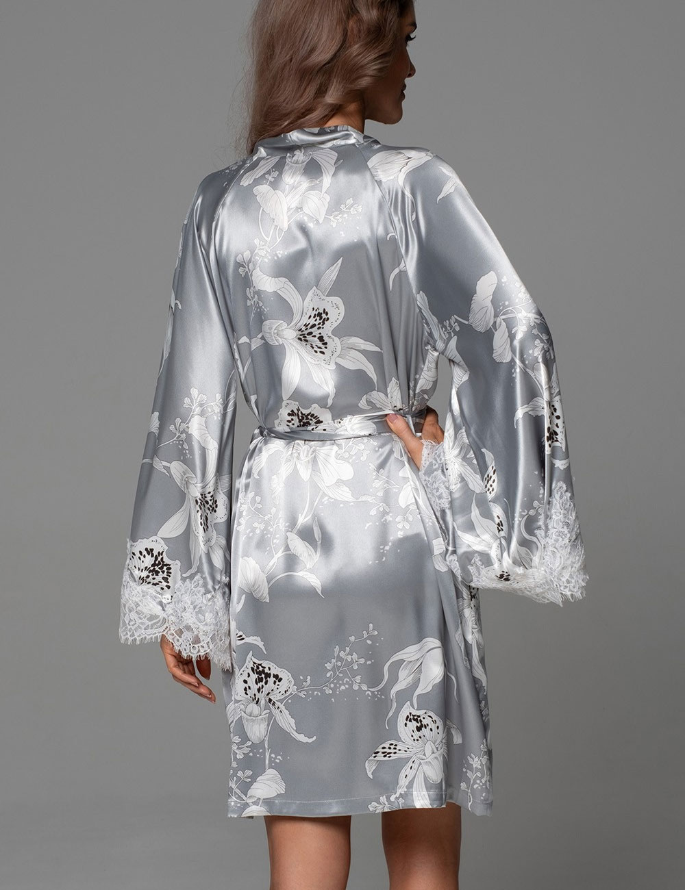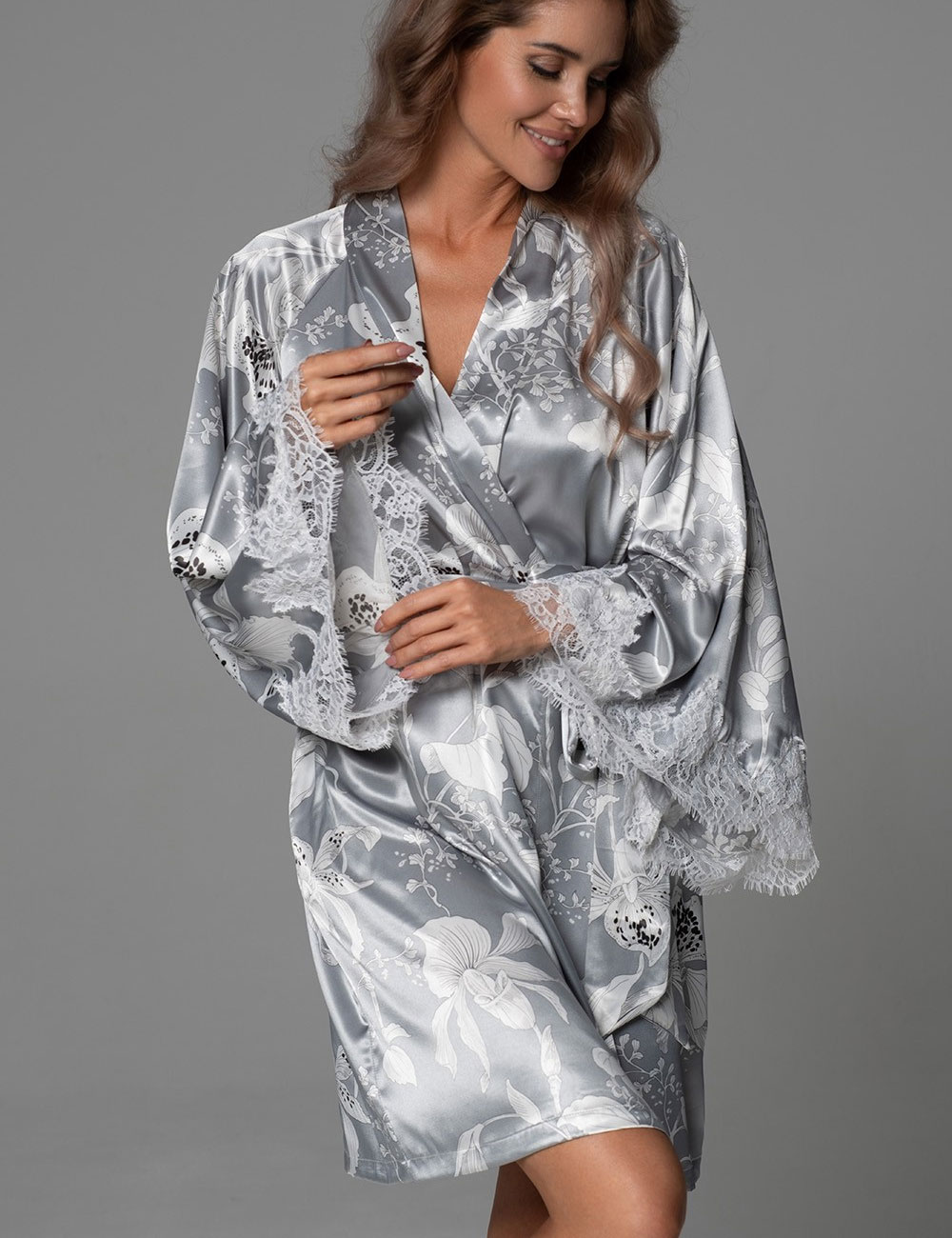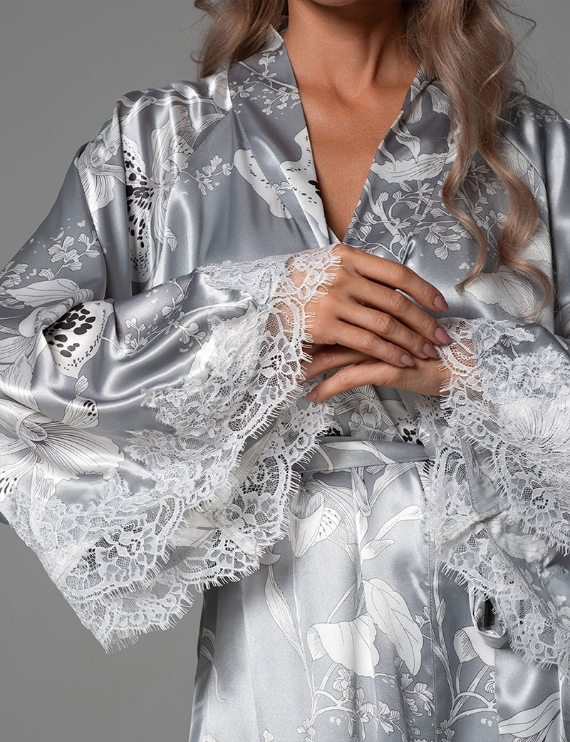 Нежный халат-кимоно ARABEL 4773 от Mia-Amore — это уютный бестселлер из смесового натурального шёлка красивого серебристого цвета с белым рисунком орхидей. Он разбудит в тебе спокойную женственность! Широкое кружево с ресничками по низу рукавов добавляет лёгкость. Идеально для утреннего кофе или вечернего чилла — чувствуй себя королевой в домашнем раю.