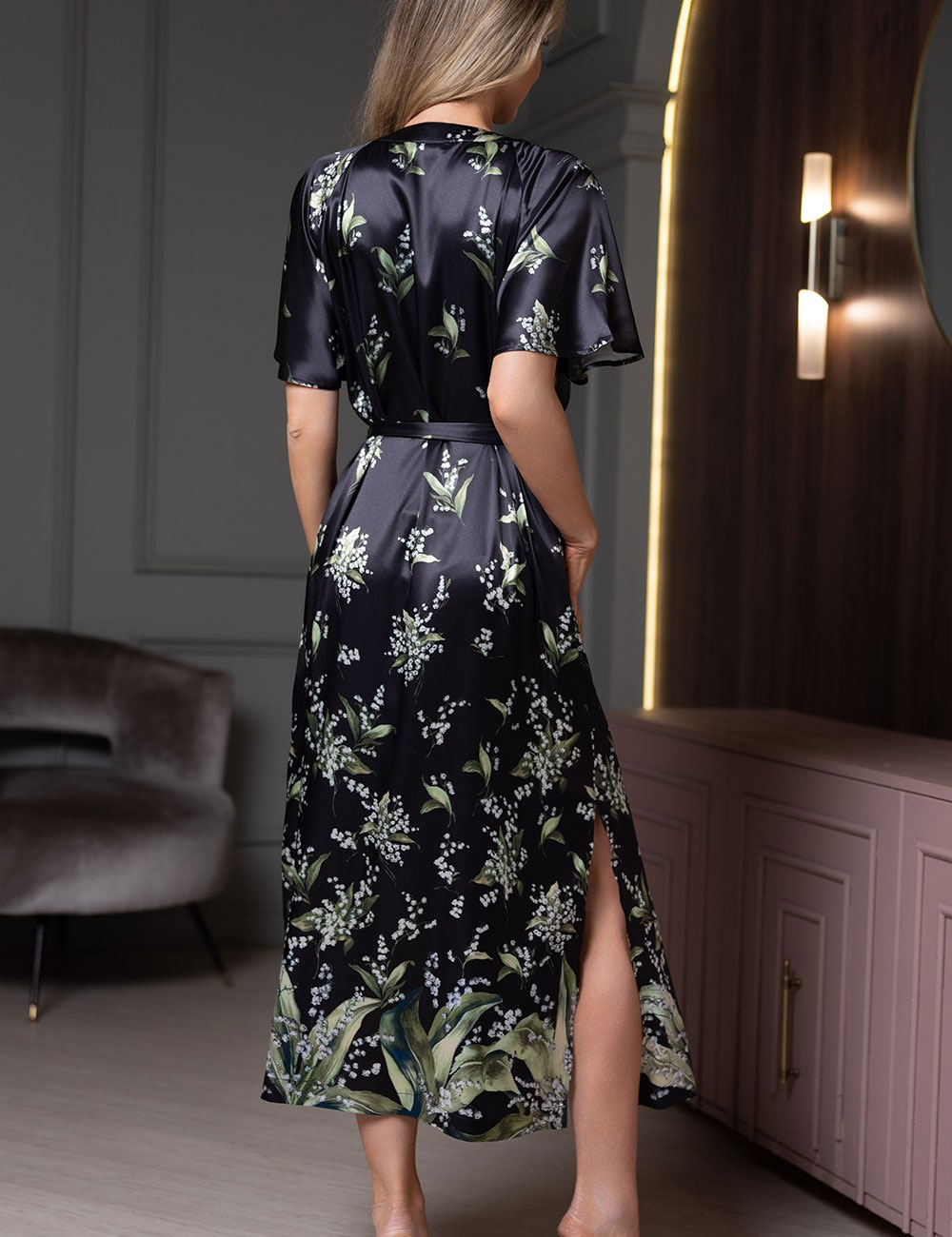 Черное платье-халат Mia-Amore LURDES модель 4558 из натурального смесового шёлка с короткими рукавами и принтом ландышей. Удобная застёжка на пуговицы и мягкий крой делают его идеальным выбором для уютного утра или лёгкой прогулки по особняку.