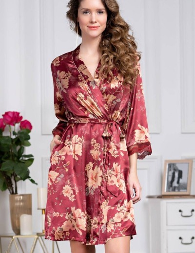 Халат-кимоно из коллекции BURGUNDIA из смесового принтованного полотна с большим содержанием натурального шелка. Терпкий и пьянящий бордовый фон дополнен композицией из бежево-золотистых цветов.