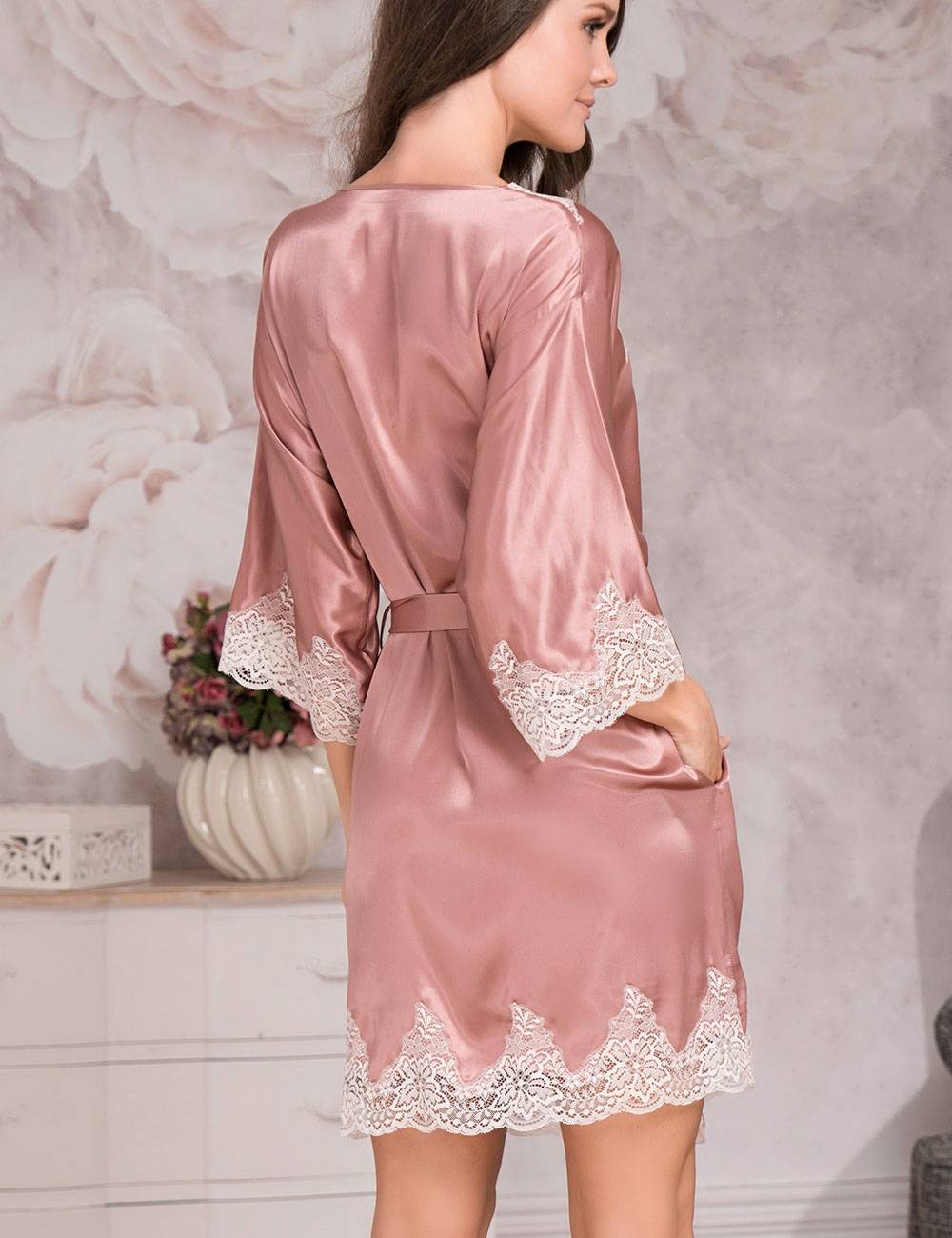 Короткий розовый халат MARILIN DELUXE 3443 от Mia-Amore в оттенке чайной розы — для тех, кто ценит изысканный комфорт: лёгкий, как дыхание, с утончённым контрастным кружевом и вырезанной кромкой ткани, он обволакивает тело мягким смесовым шёлком — удобный в любое время года.
