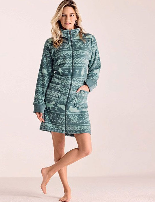 Тёплый халат POLARIS PLR3011 от Infiore из мягкого пушистого флиса обволакивает нежностью зимнего уюта. Белые медведи, словно скользящие по снегу, и снежинки оживают на ткани — нежный узор будто рассказывает сказку. Свободный крой и приглушённый зеленоватый оттенок превращают каждый день в мгновение тёплой роскоши.