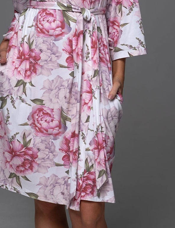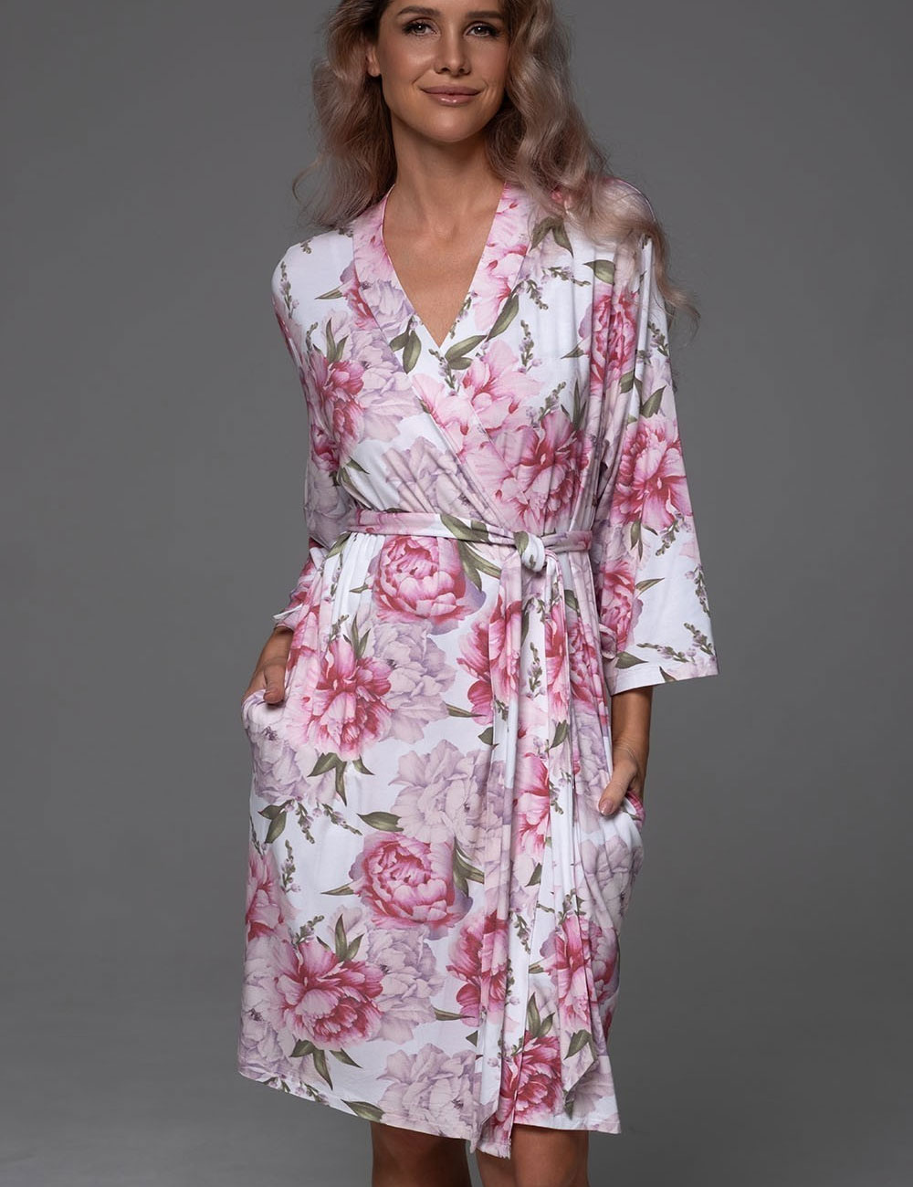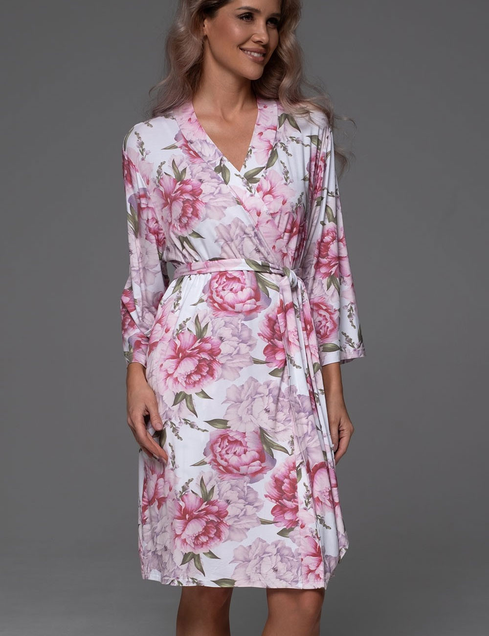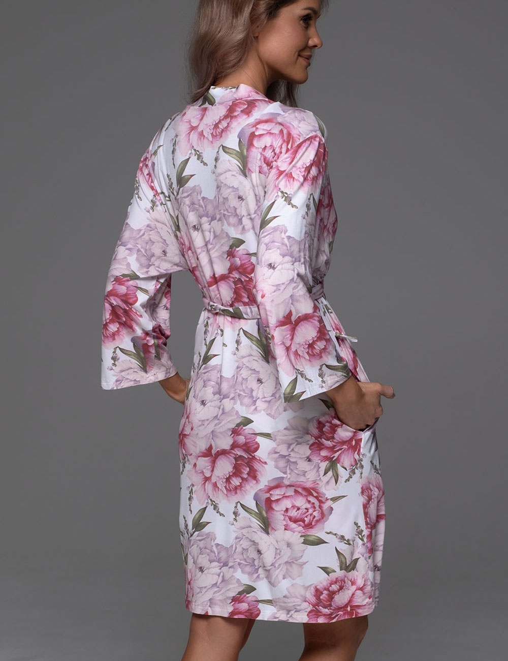 Короткий домашний халатик ABBEY 5553 от итальянсокго бренда Mia-Amore выполнен из мягкого вискозного трикотажа с нежным молочным фоном и ярким принтом белых и красных пионов. Легкий и удобный, он придаёт образу свежесть и женственность, идеально подходя для семейного уюта и отдыха.