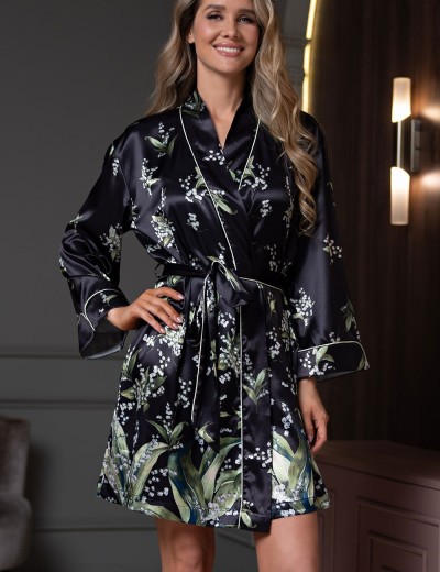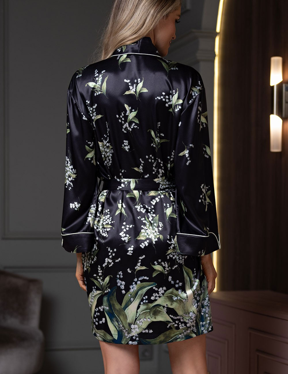 Укороченный халат до колен Mia-Amore LURDES модель 4553 из смесового натурального шёлка с купонным мотивом ландышей на тёмном фоне. Лёгкий, стильный и удобный — идеальный акцент в образе для дома или быстрого выхода к соседке.