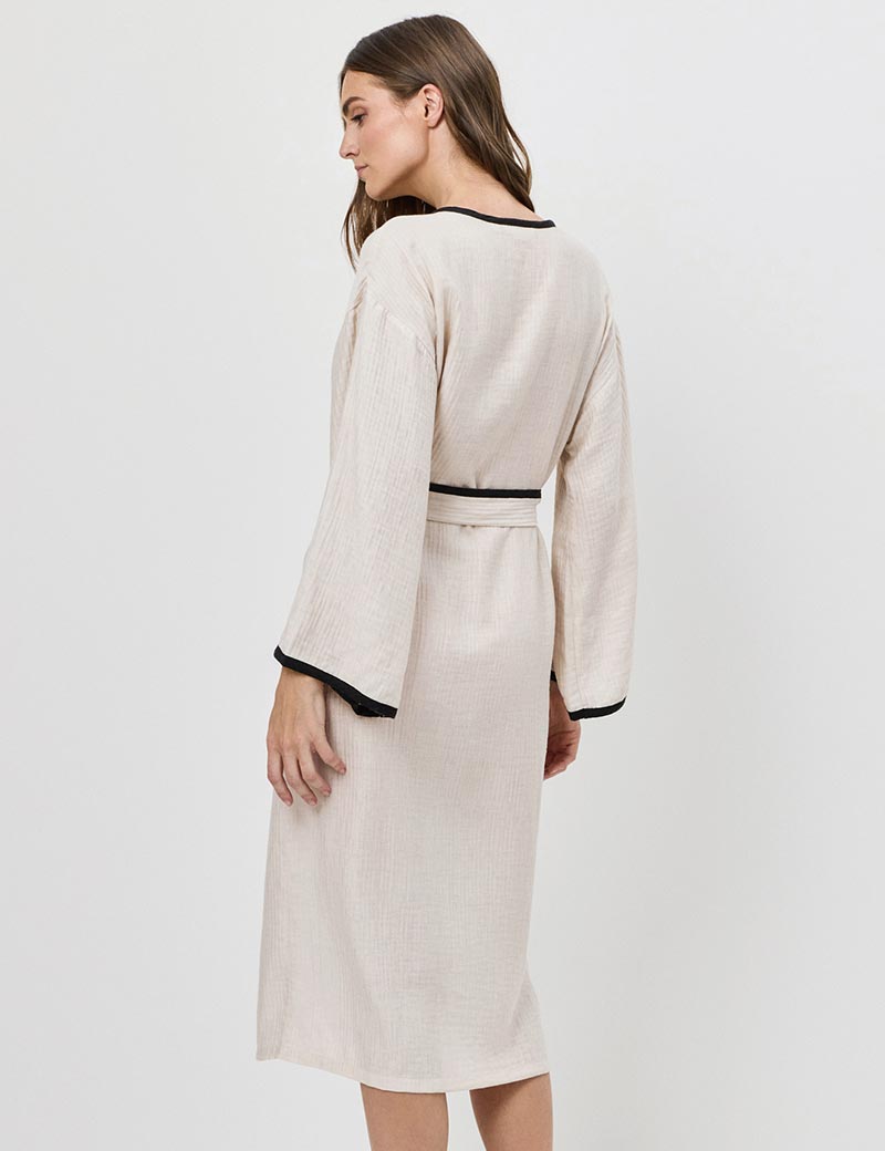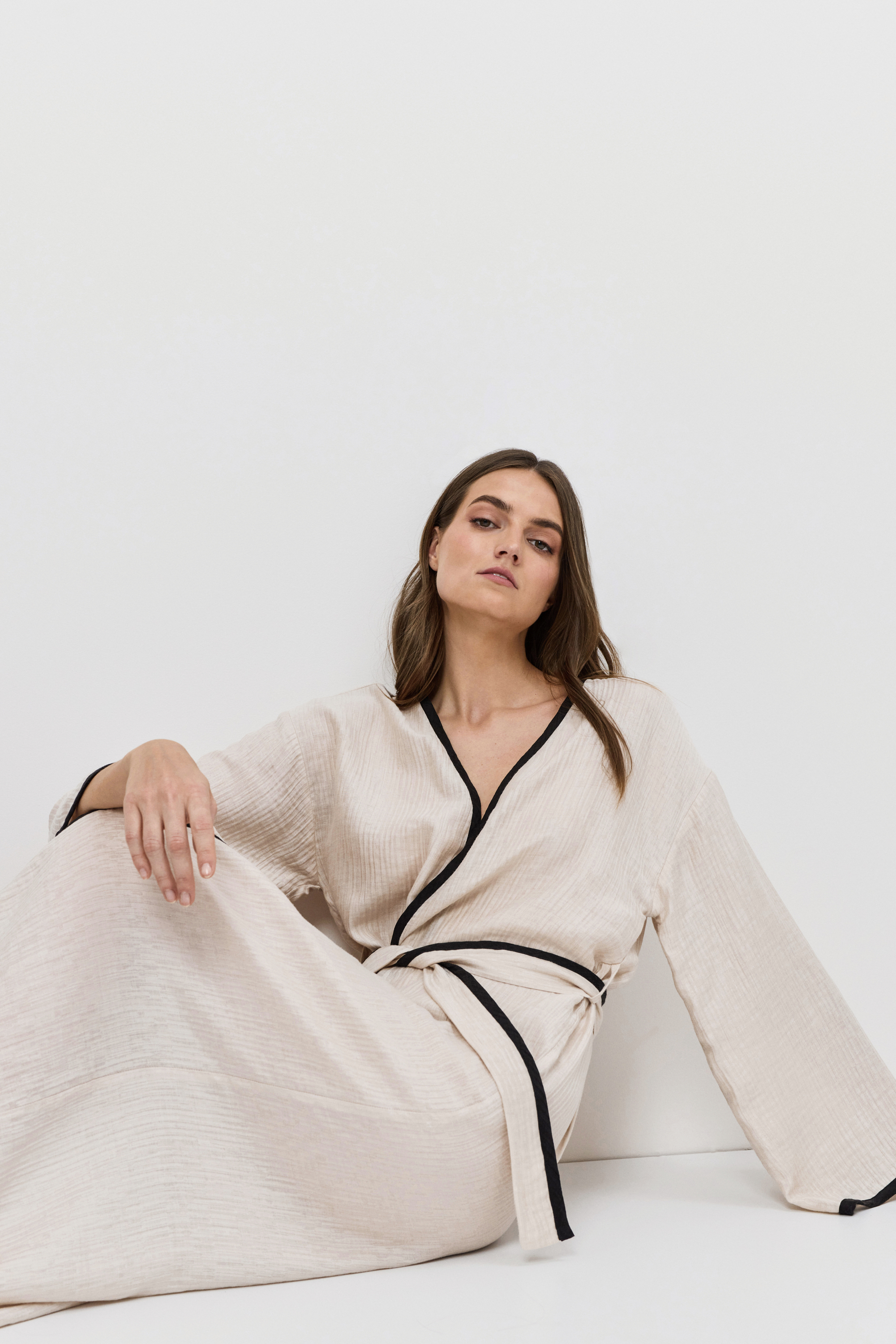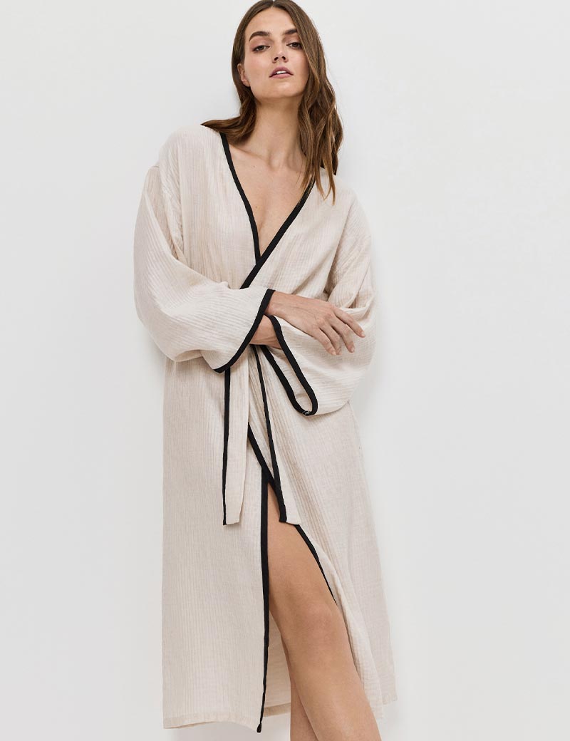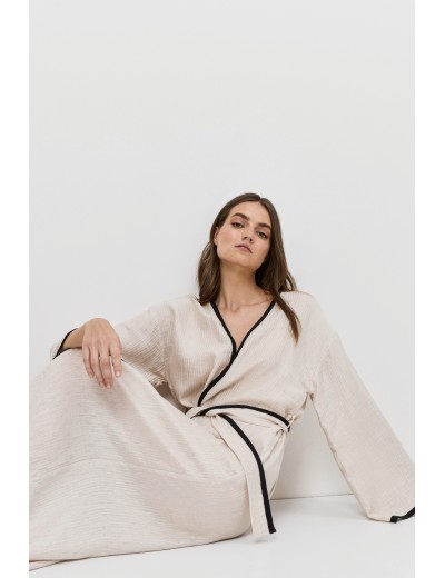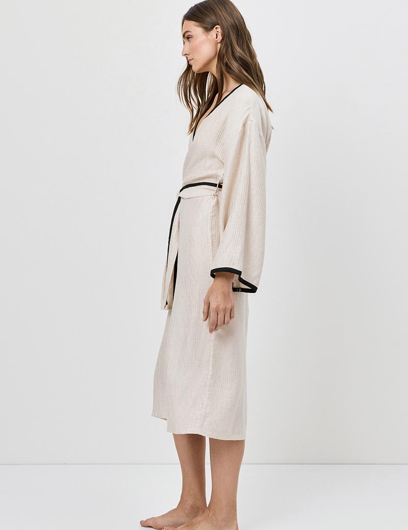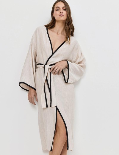 Длинный халат HORIZON от литовского бренда Aruelle выполнен из мягкого смесового полотна с большим содержанием вискозы, в натуральном бежевом оттенке с контрастной черной отделкой.