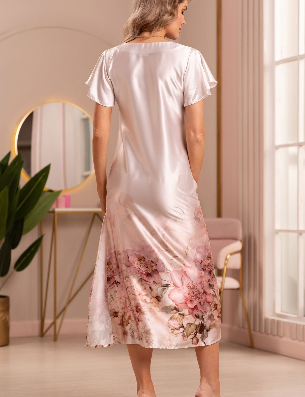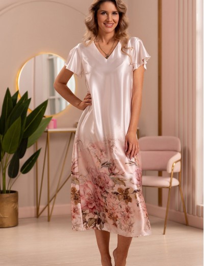 Длинная сорочка Mia-Amore 4945 из коллекции ALORA – изящный силуэт с короткими расклешенными рукавами, выполнена из смесового натурального шёлка. Нежно-розовые пионы на лёгкой ткани обволакивают тело, даря комфорт и элегантность для сна и домашних вечеров.