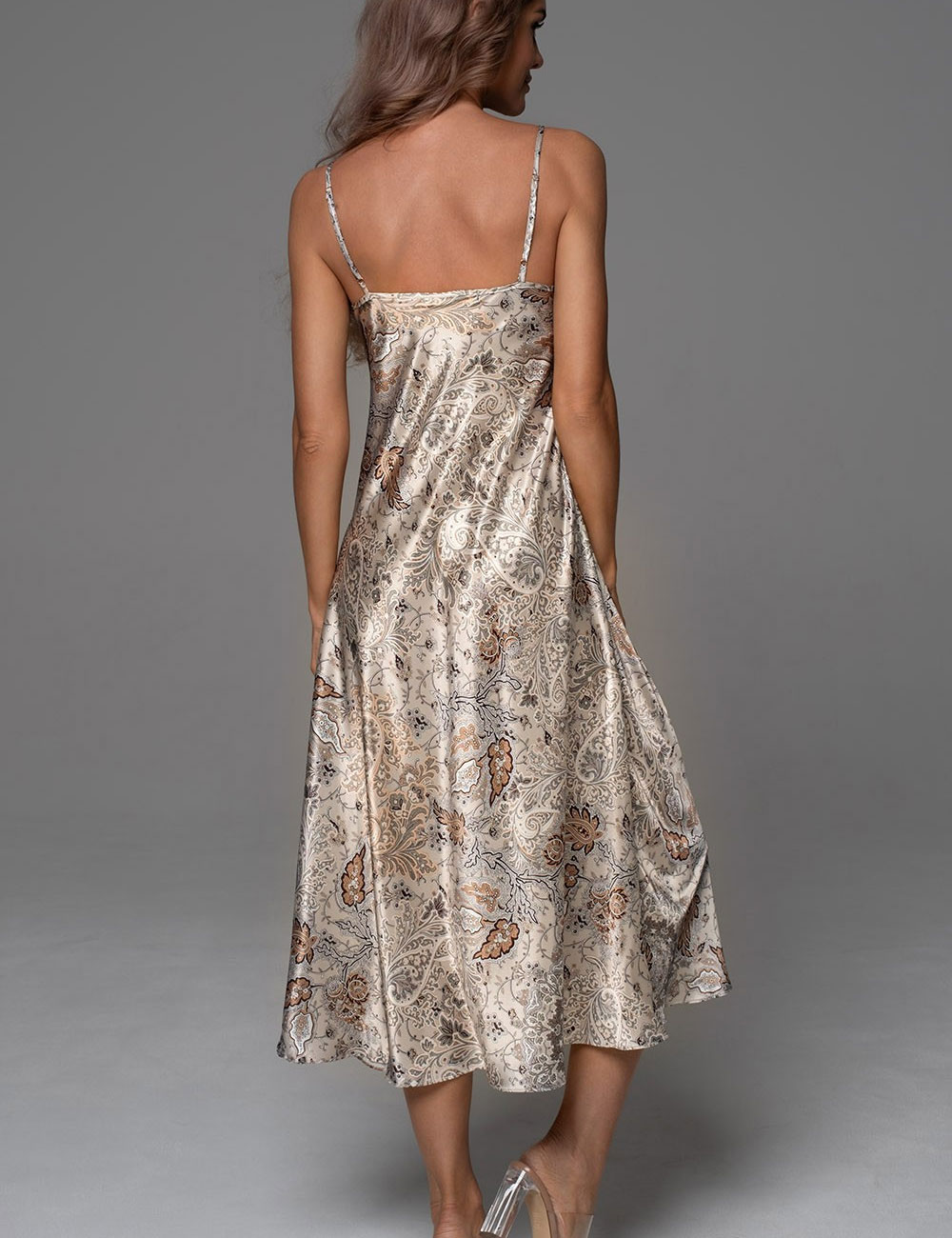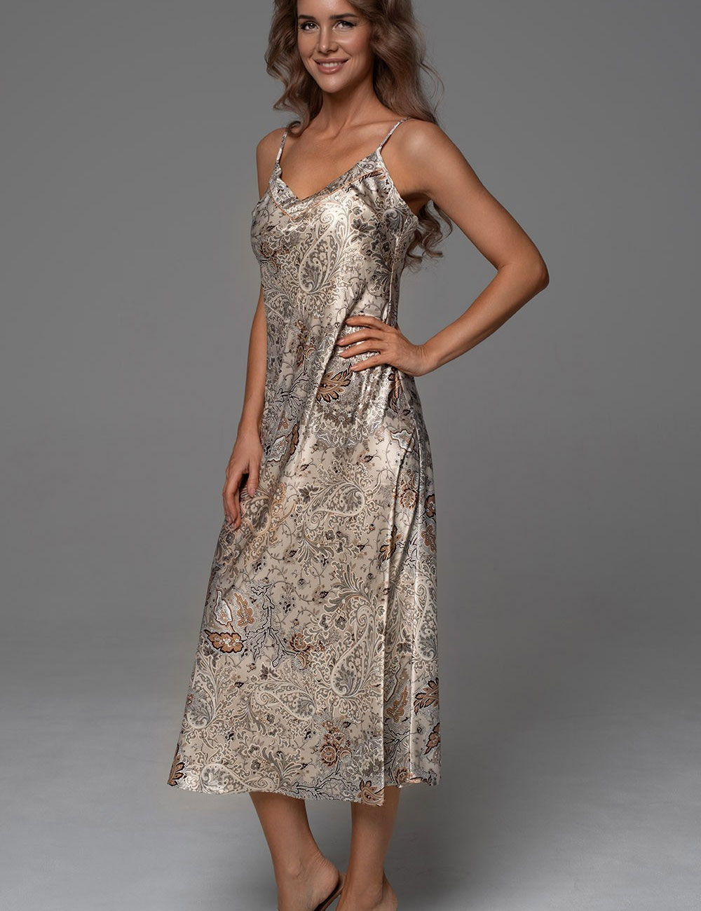 Роскошная ночная сорочка LIVIA 4356 от брнеда Mia-Amore из смесового натурального шёлка с восточным принтом в серо-бежевых тонах, мягкая и приятная на ощупь. Расклешенный подол и изящные линии подчеркивают женственность, превращая ночь в сказку. Идеальный компаньон для уютного сна.