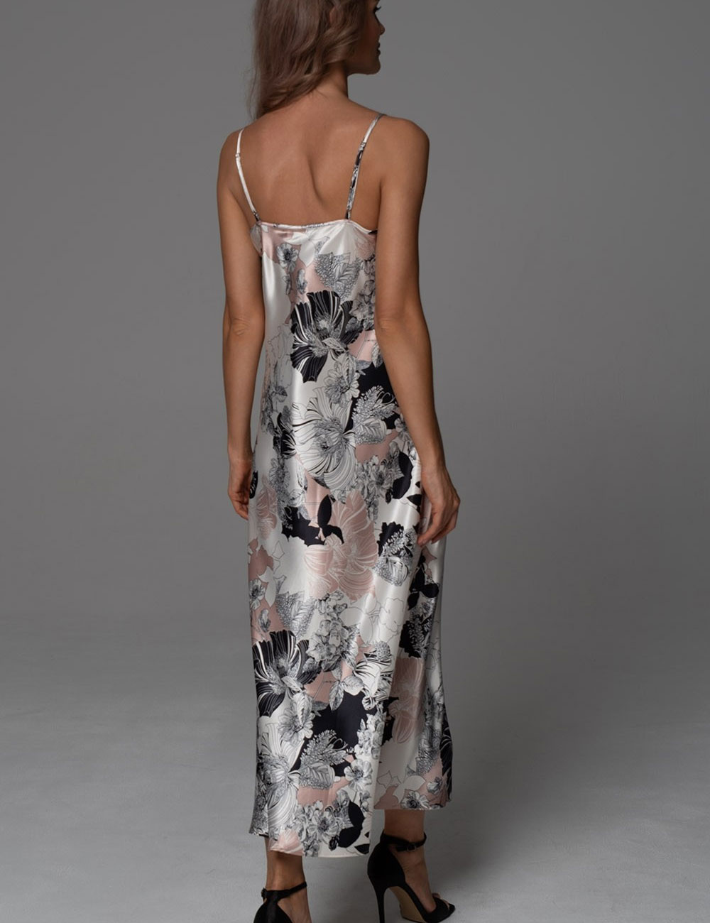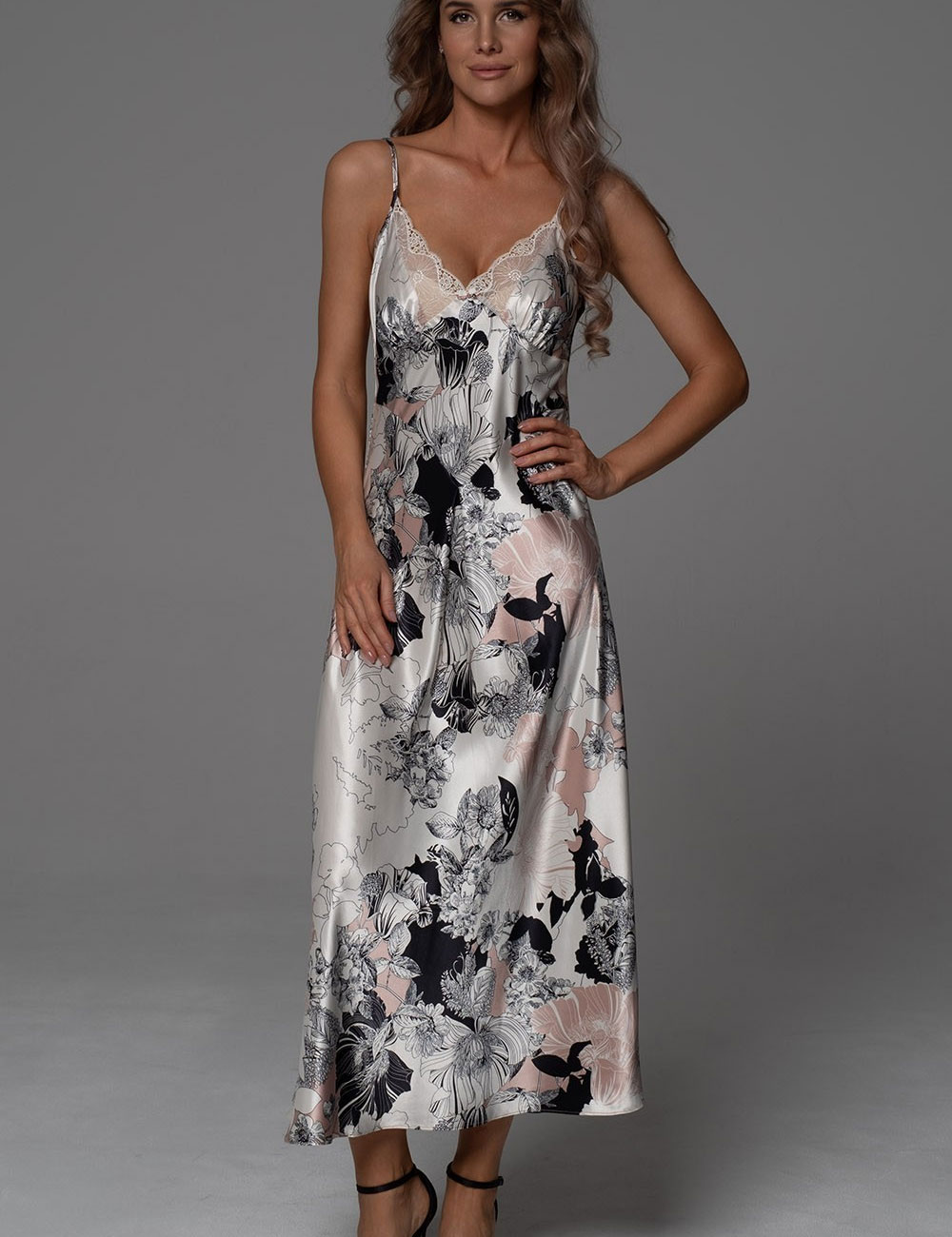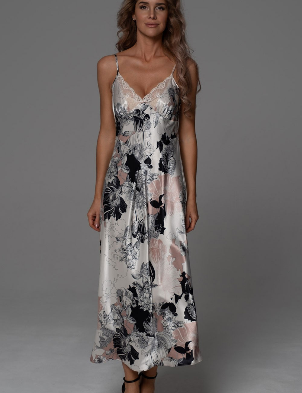 Длинная ночная сорочка Mia-Amore 4768 из коллекции TRINITY с кружевной отделкой по вырезу декольте — пик роскоши с восточным акцентом. Выполнена из смесового натурального шёлка, мерцающего перламутром и украшенного цветочным принтом. Комфортная, романтичная и полная магии, чтобы ваши сны были как волшебная сказка.