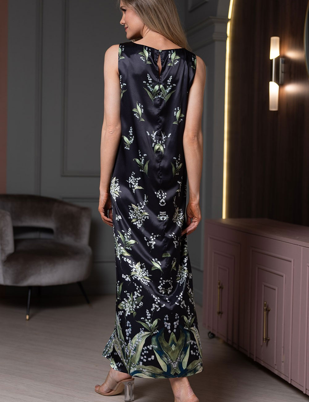 Шёлковое длинное платье Mia-Amore 4557 из коллекции LURDES с разрезами по бокам и принтом ландышей на фоне иссиня-черной гаммы. Натуральный смесовый шёлк с блеском придаёт платью особое сияние, вдохновлённое природной эстетикой. Лёгкое, женственное и идеально подходит для элегантного отдыха.