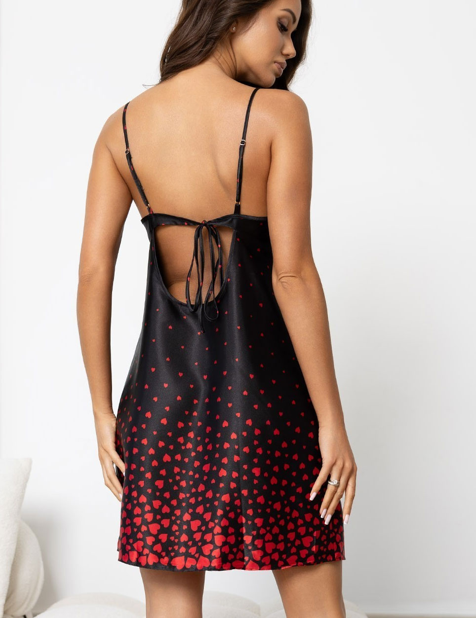 Короткая ночная сорочка Mia-Amore 2321 из коллекции NOEMI — эффектная модель с вырезом на спинке и завязкой. Выполнена из черного шелковистого атласа с принтом красных сердечек. Пробуждает внутреннюю радость и молодость, вдохновляя на игривый флирт!