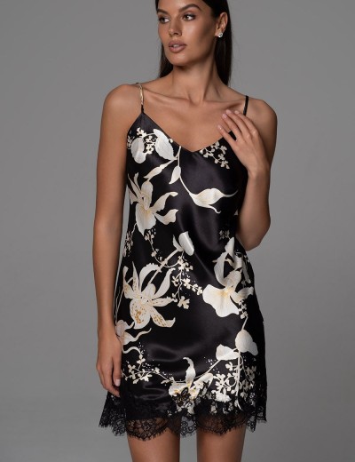 Короткая ночная сорочка Mia-Amore ARABEL (модель 4770) выполнена из блестящего смесового шёлка глубокого чёрного цвета с нежным белым рисунком орхидей. Она пробуждает чувство деликатной элегантности и спокойной женственности. Широкое французское кружево с ресничками по низу мягко подчёркивает силуэт, добавляя лёгкое сияние. Это идеальный выбор для расслабления после долгого дня.