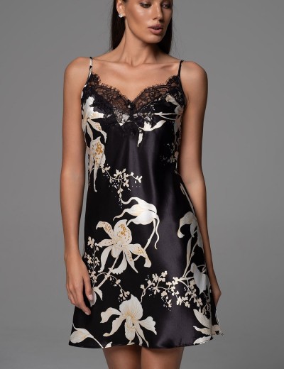 Ночная сорочка ARABEL 4771 от Mia-Amore из смесового натурального шёлка черного цвета с белым контурным принтом орхидей дарит ощущение утончённой роскоши для спокойных ночей. Широкое кружево, украшающее лиф, добавляет воздушности и изящества, делая её идеальным выбором для уютных моментов отдыха, когда хочется подчеркнуть свою внутреннюю гармонию.