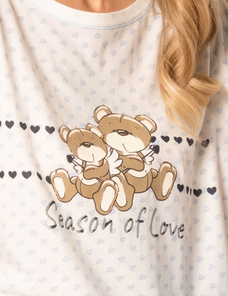 Удлинённая футболка LOVER LO41 от Sielei из мягкого, дышащего хлопка, идеальна для сна, отдыха и повседневного ношения в тёплое время года. На груди — принт с плюшевым мишкой в образе Купидона, вокруг — мелкие розовые сердечки. Простой крой, комфортная посадка, натуральная ткань.
