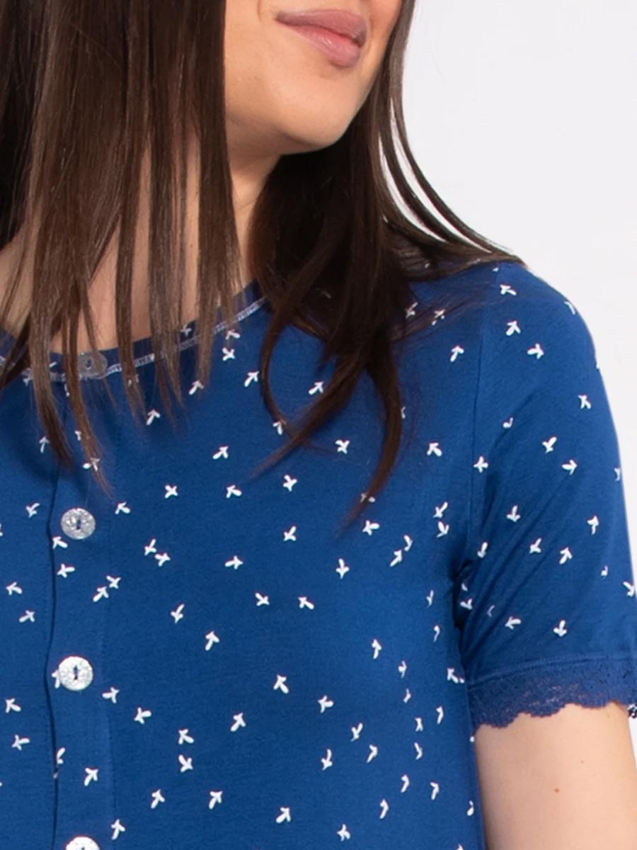 Сорочка на пуговицах Sielei LV72 из коллекции LEAVES изготовлена из ультрамягкой вискозы синего цвета с ненавязчивым принтом из мелких листочков. Короткие рукава украшены нежным кружевом в тон, что придает романтический и изысканный вид.