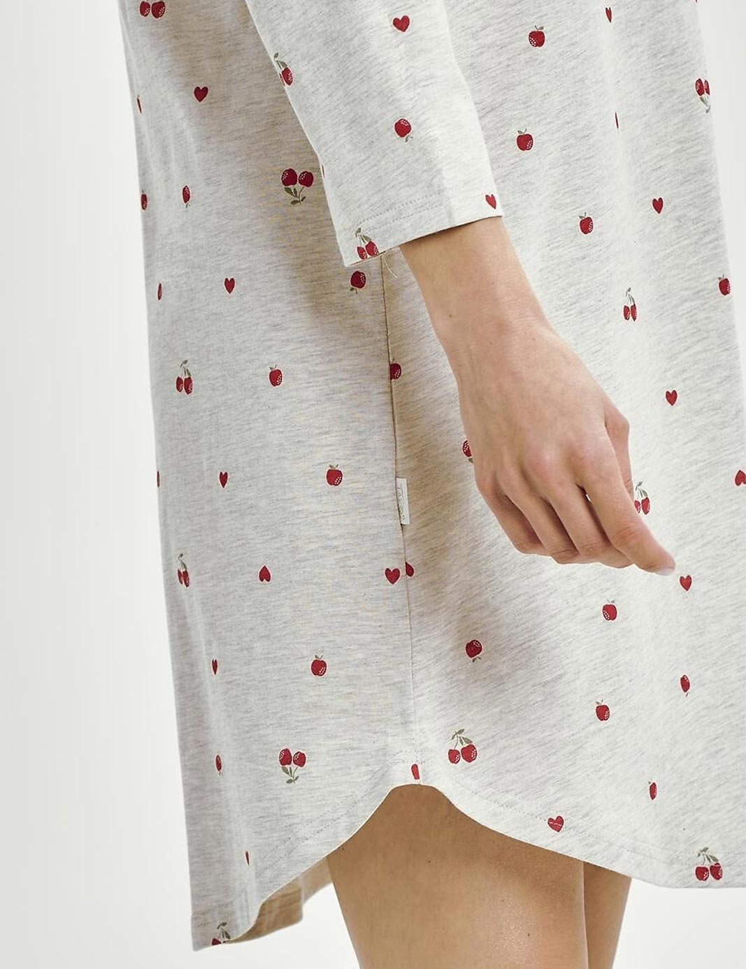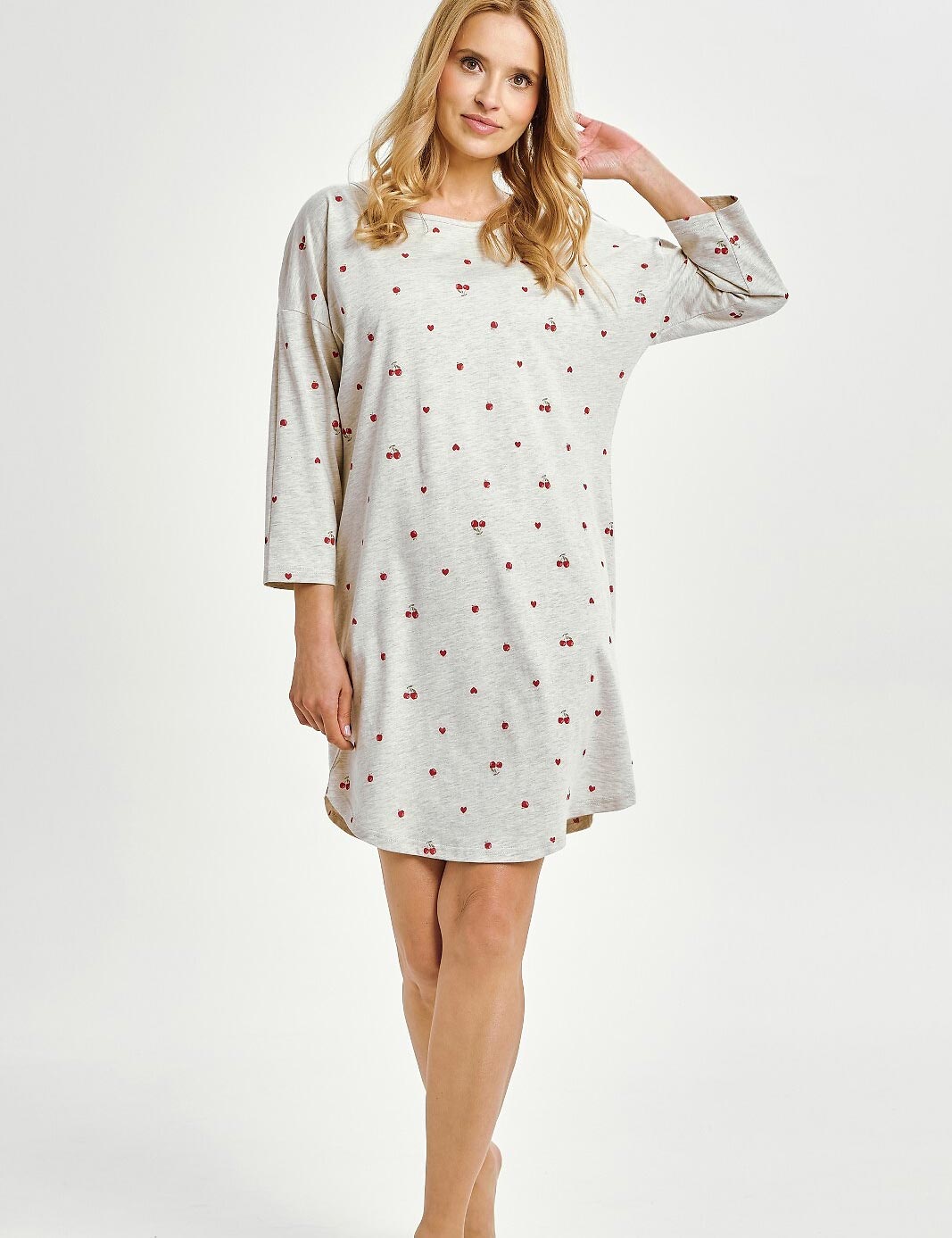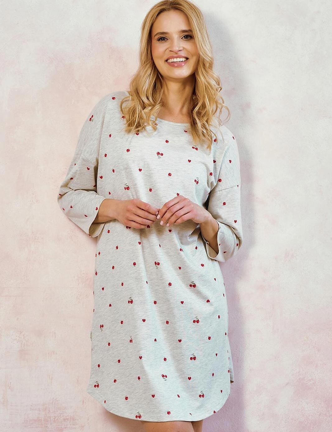 Женская сорочка 3431 ADELE от польского бренда Taro выполнена из хлопкового трикотажа в сером цвете с мотивом крошечных яблок. Этот дизайн придает изделию легкий девичий шарм, а удобный крой, подходящий для повседневного использования, обеспечивает комфорт во время сна и отдыха дома.