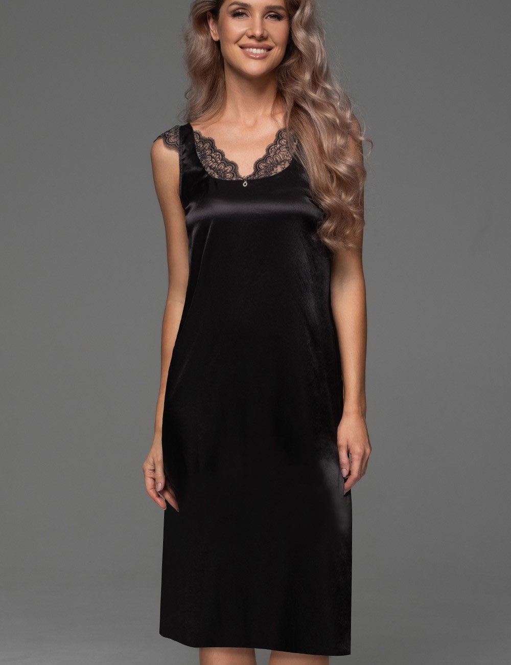 Ночная сорочка ADELAIDA 4707 от бренда Mia-Amore из смесового натурального шёлка в чёрном цвете – идеальна для романтических ночей, где каждая минута наполнена магией. Оригинальные бретели и кружевная горловина подчёркивают красоту плеч. Эмоции страсти и комфорта окутывают, позволяя чувствовать себя героиней собственной истории любви, полной романтики и тайны.