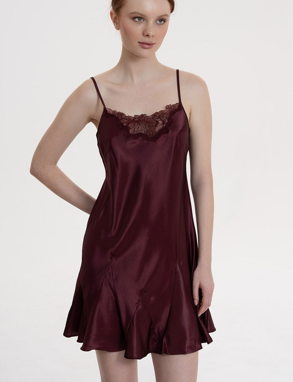 Короткая сорочка Mia-Amore 4591 из коллекции LILIROSE винного цвета – игривая и лёгкая, с пышным низом, декорированным вставками-клиньями. Выполнена из смесового шёлка и вышивного кружева с цветочными мотивами. Она добавляет образу шарм и намёк на романтику, идеальна для тех, кто ценит утончённую элегантность в моменты отдыха.