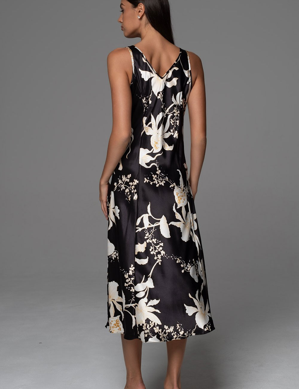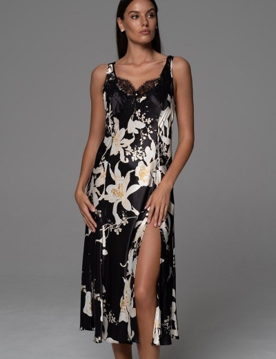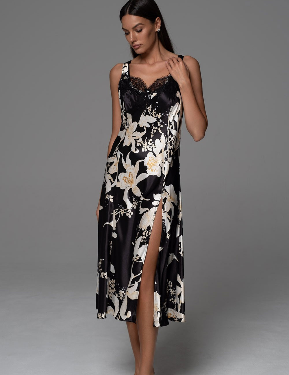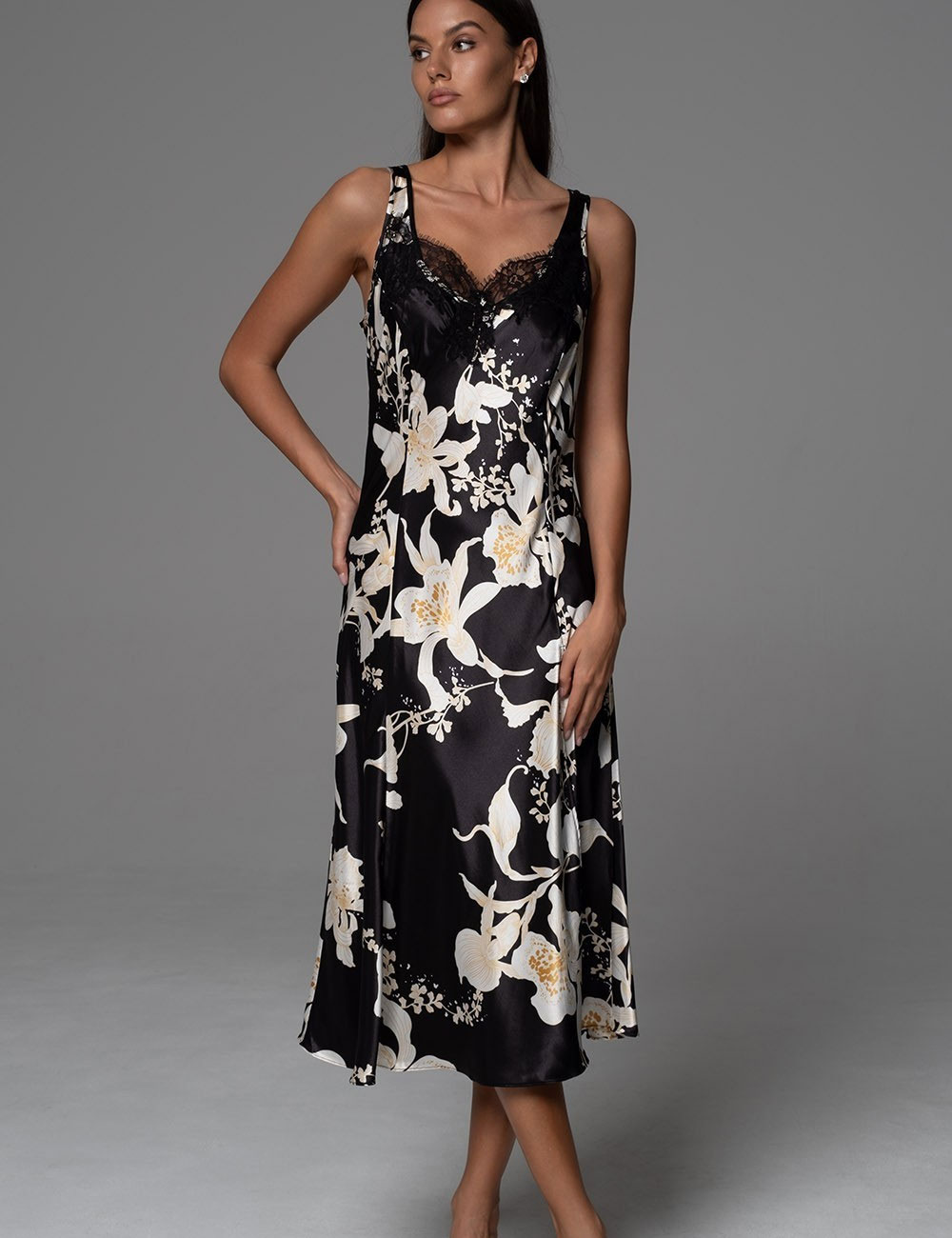 Длинная сорочка Mia-Amore ARABEL 4778 с рельефами выполнена из натурального смесового шёлка чёрного цвета, украшенного белым контурным принтом орхидей, что придаёт образу спокойную женственность. Тонкое французское кружево с ресничками на краях усиливает ощущение лёгкого сияния, подходя для домашних ритуалов, где комфорт сочетается с утончённой чистотой.