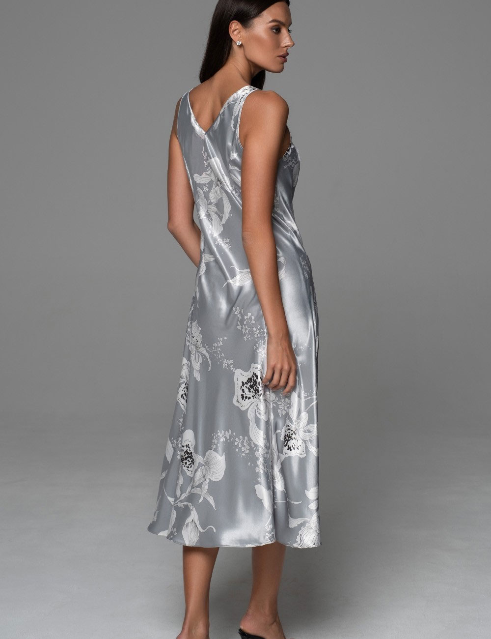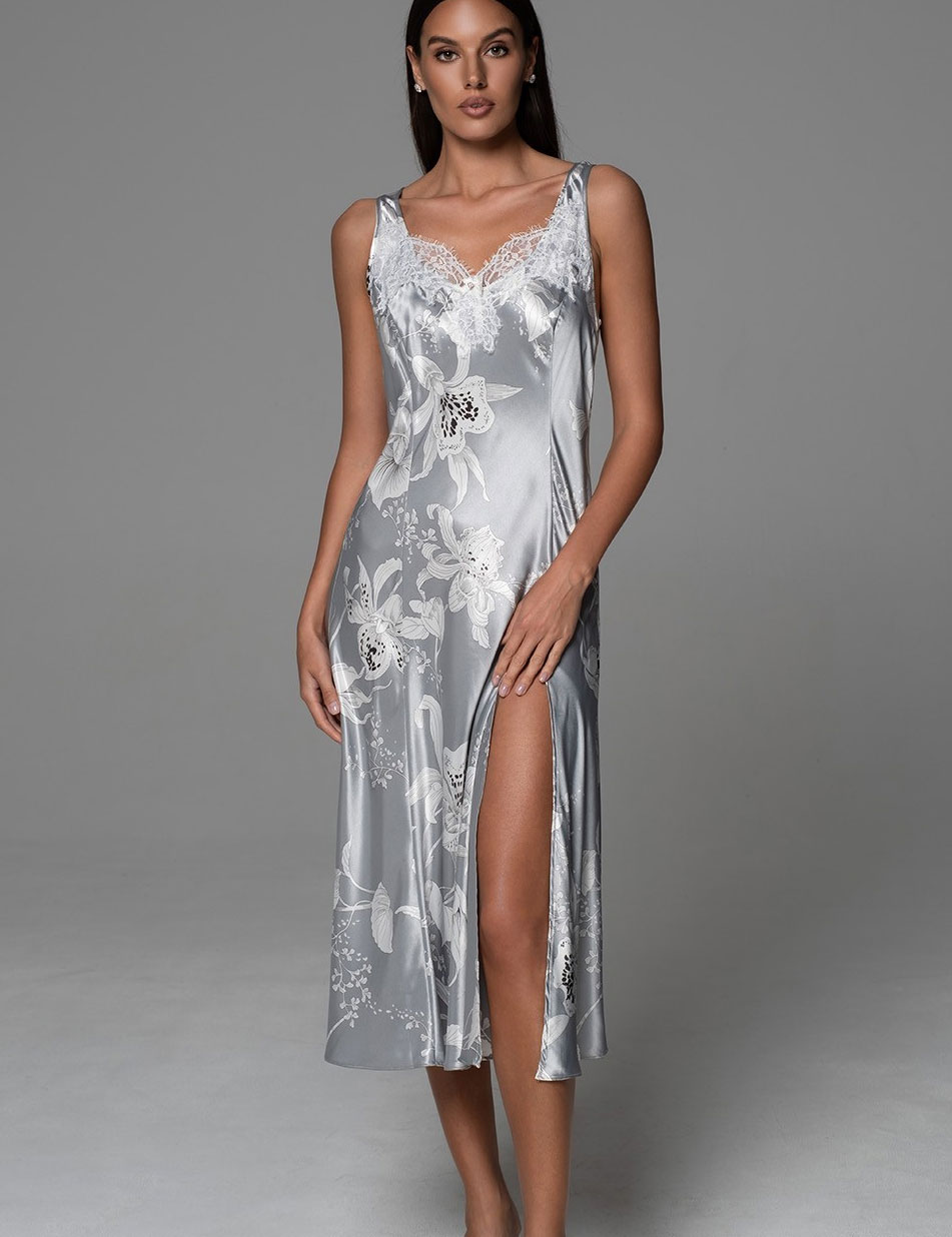 Сорочка длиной макси ARABEL 4778 от Mia-Amore в цвете серебра — идеальный выбор для уютных домашних ритуалов перед сном. Она сочетает комфорт с утончённой чистотой. Выполнена из натурального смесового шёлка с белым контурным принтом орхидей, который придаёт образу спокойную женственность. Рельефные швы по фигуре и отделка французским кружевом с ресничками усиливают ощущение эйфории.