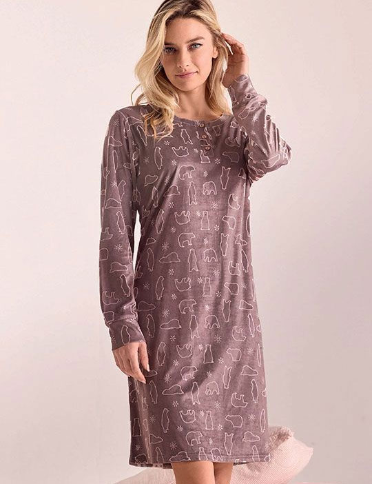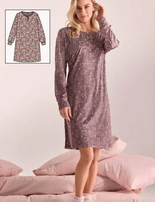 Теплая сорочка Infiore PLR2869 из коллекции POLARIS, выдержанная в тихом коричневом оттенке, украшена забавным принтом с белыми медведями — нежный микрофлис обволакивает тело мягкостью, даря тепло и уют в прохладные дни, будто лёгкий шёпот зимнего леса.
