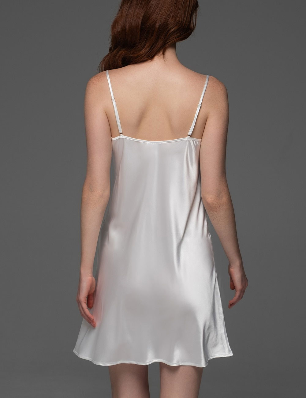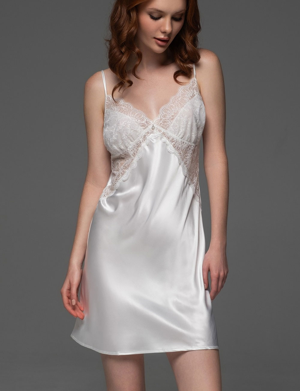 Нежная сорочка ADELAIDA 4700 от бренда Mia-Amore из смесового натурального шёлка в белом цвете – воплощение утончённой невинности для свадебных фотосессий или сладкого сна. Вышивное кружево на лифе придаёт шарм, делая образ соблазнительным. Дарит ощущение свежести и лёгкости, идеальна для романтических пробуждений, где каждая деталь подчёркивает вашу красоту.