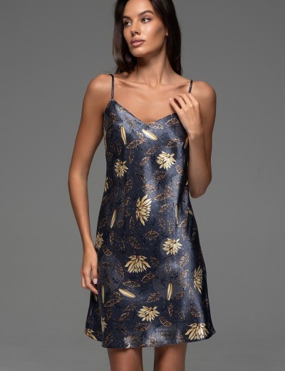 Ночная сорочка Mia-Amore модель MARYGOLD 4691 на тонких бретелях — изысканный выбор из смесового натурального шелка с нежным блеском, который окутывает уютом. Темно-синий фон оживает бежевыми бутонами, листьями и геометрическим орнаментом. Сочетая природную красоту и классический стиль, модель гарантирует комфортные ночи и приятный сон.