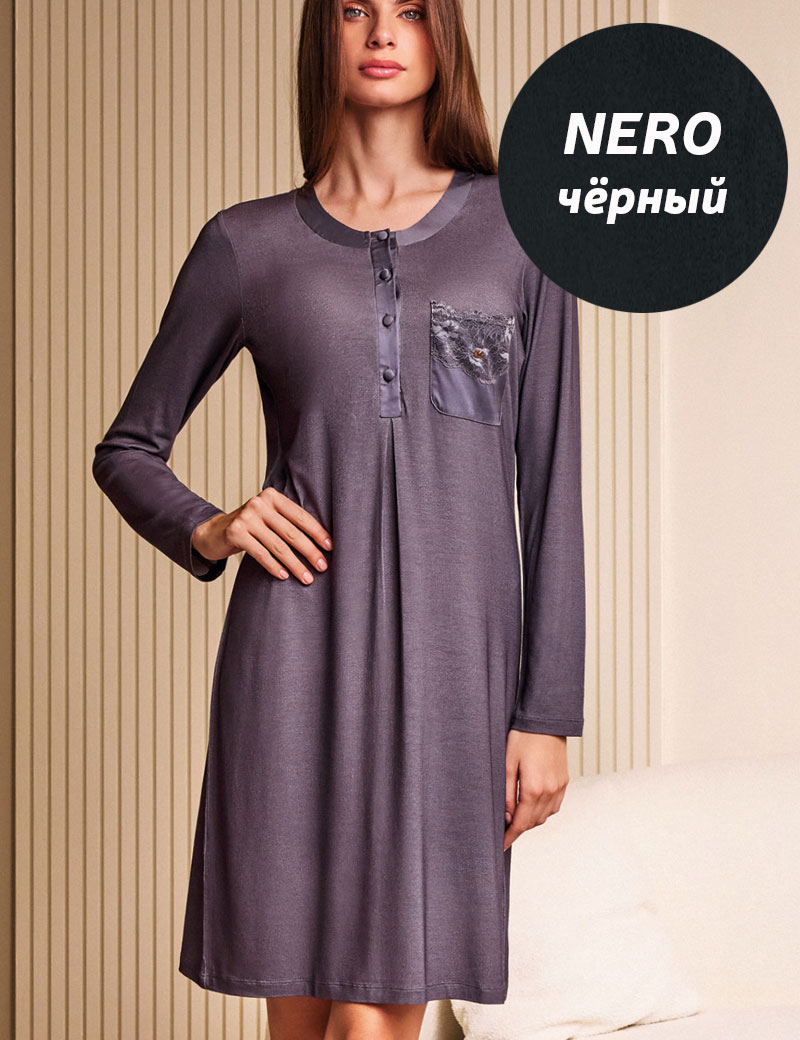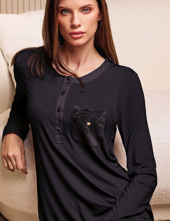 Женская ночная рубашка Lormar 630780LU из коллекции SATEN — воплощение элегантности в глубоком чёрном. Сшита из мягкой трикотажной вискозы, дополнена кружевом и акцентами атласа, с длинными рукавами.