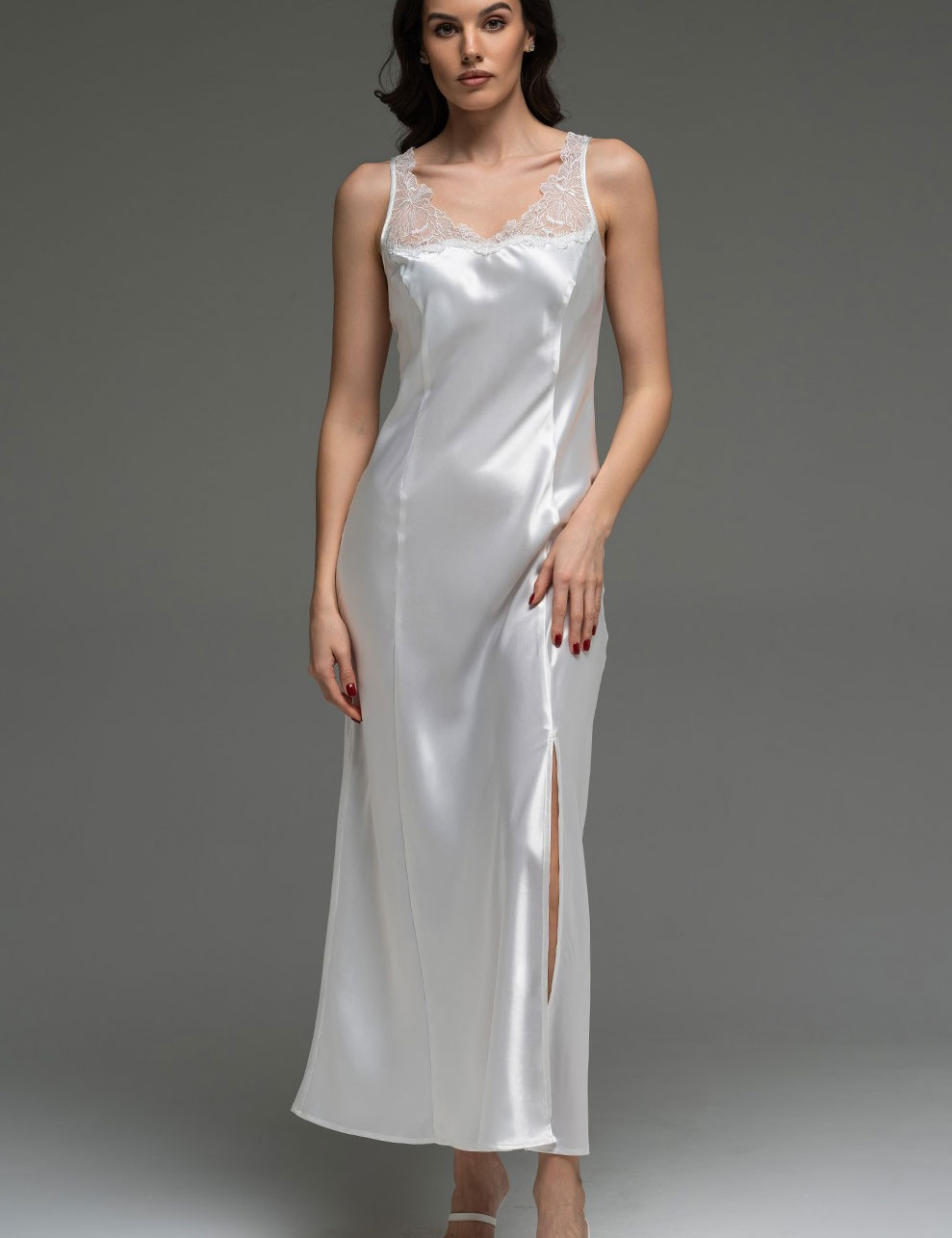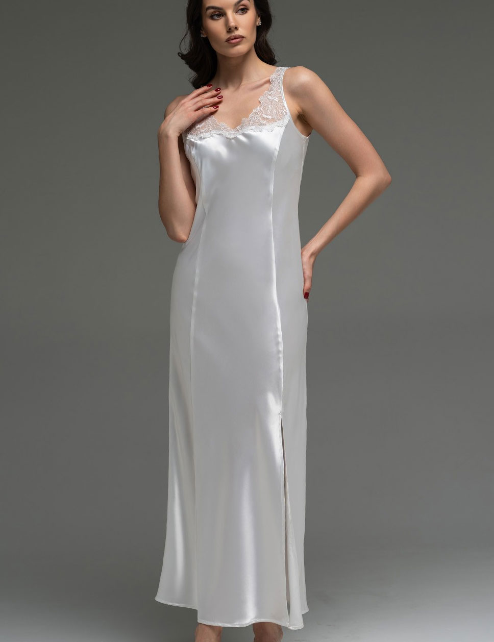 Длинная ночная сорочка Mia-Amore LILIROSE модель 4598 из смесового натурального шёлка. Лёгкий белый силуэт с кружевными бретелями на цветочных мотивах нежно подчёркивает линию груди. Идеальна для сладкого сна и пробуждения в атмосфере элегантности.