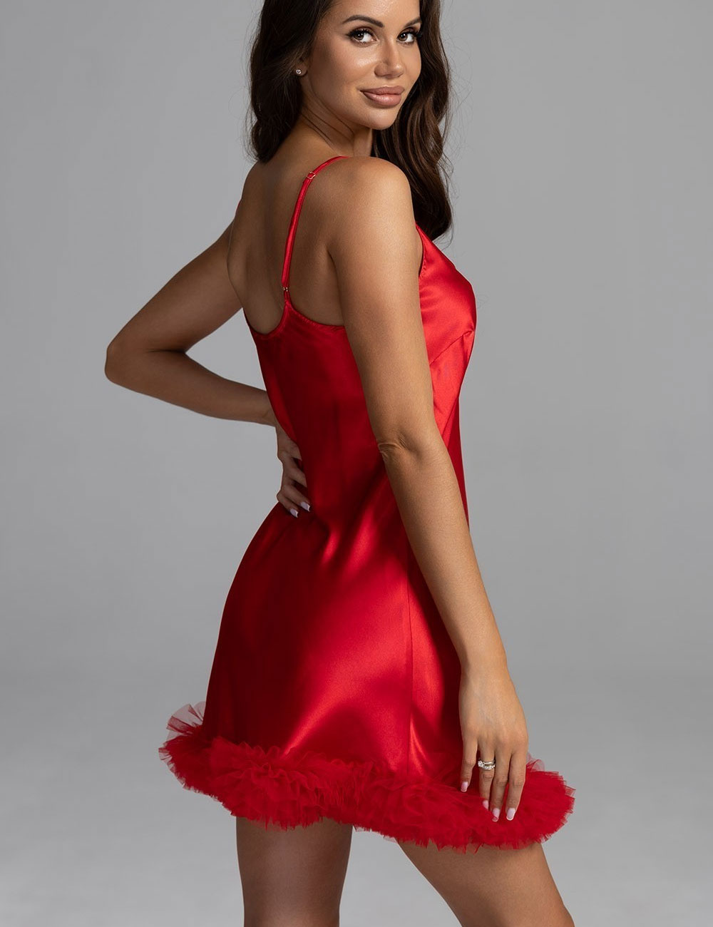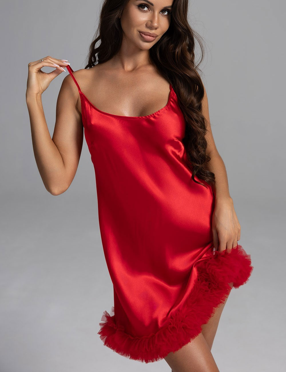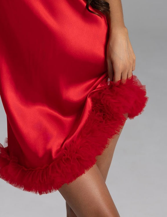 Роскошная ночная сорочка LOLI 2310 от Mia-Amore из красного атласа с пышной многослойной сетчатой рюшей по низу — мягкий блеск ткани, подчёркивающий соблазн. Создана для праздника в постели: лёгкая и притягательная, она окутывает тело нежной гармонией, разжигая эмоции.